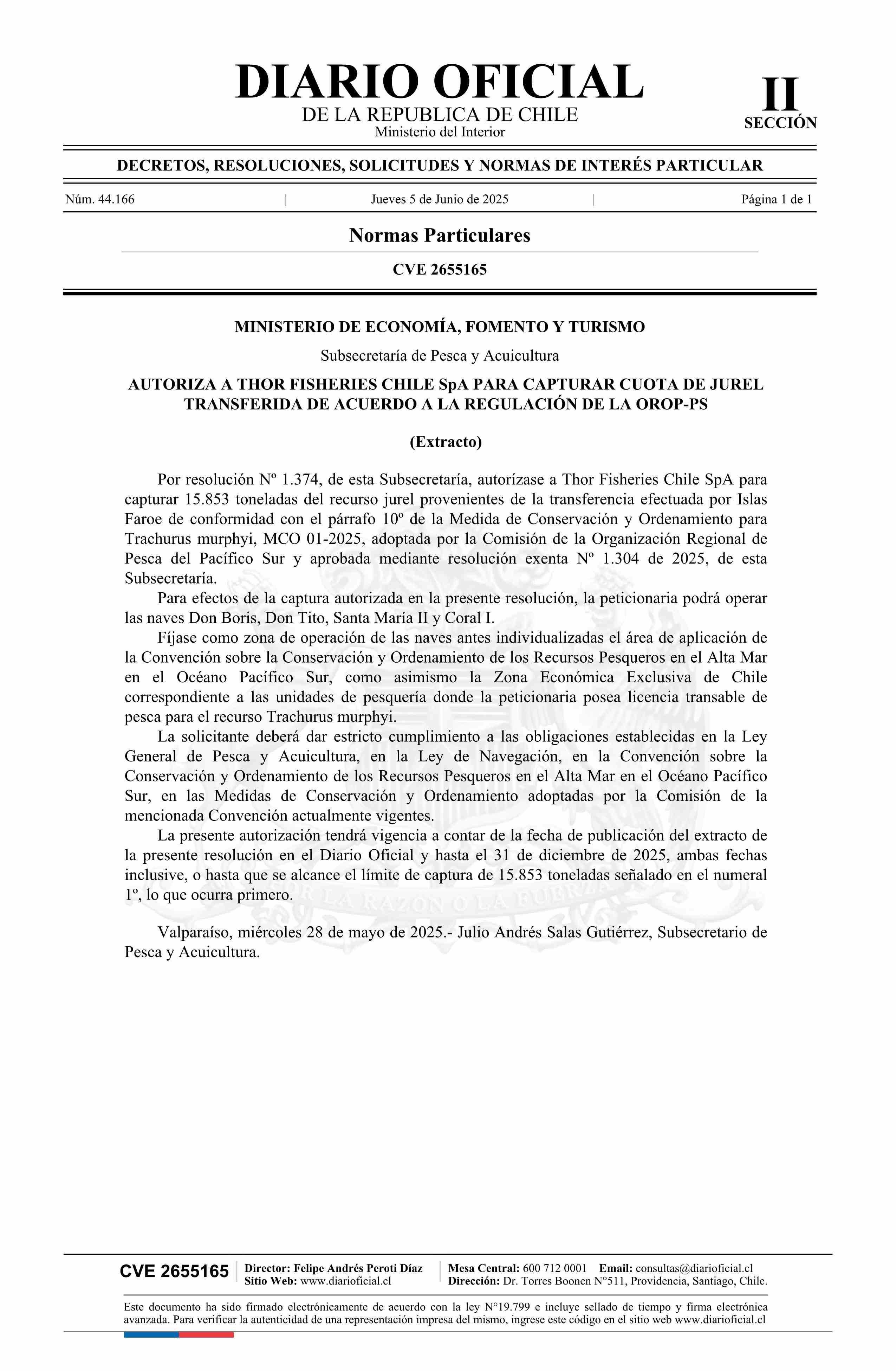 | Título: | Extracto de resolución número 1.374, de 2025.- Autoriza a Thor Fisheries Chile SpA para capturar cuota de Jurel transferida de acuerdo a la regulación de la Organización Regional de Ordenación Pesquera del Pacífico Sur |