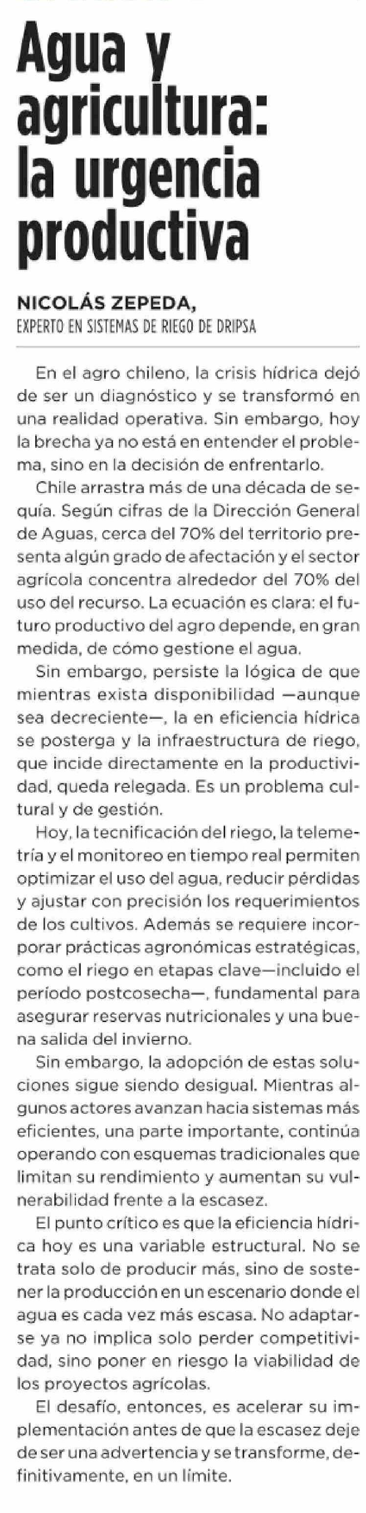 Título: Columnas de Opinión: Agua y agricultura: la urgencia productiva