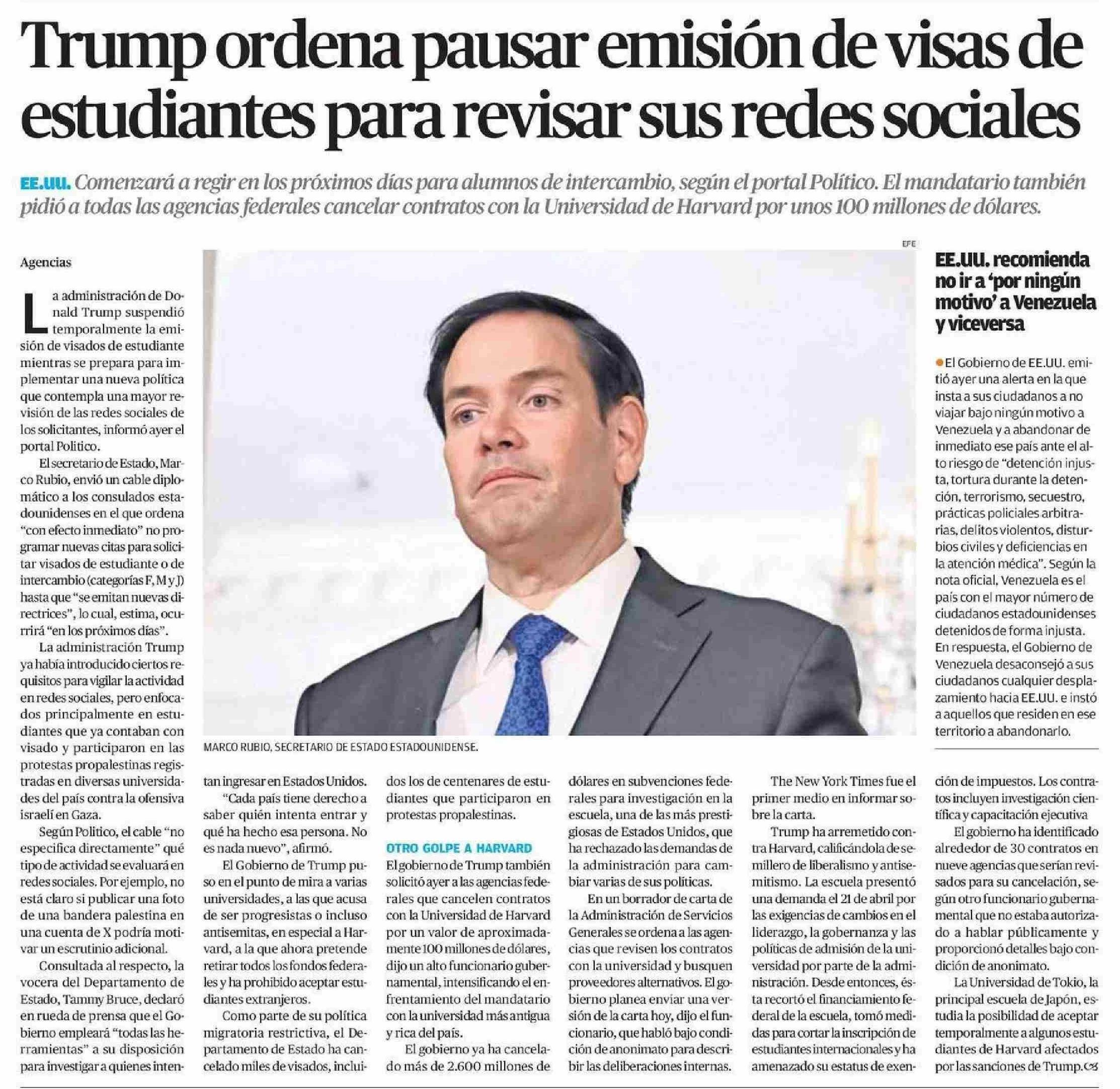 Trump ordena pausar emisión de visas de estudiantes para revisar sus redes sociales 28-05-2025 El Mercurio de Calama |