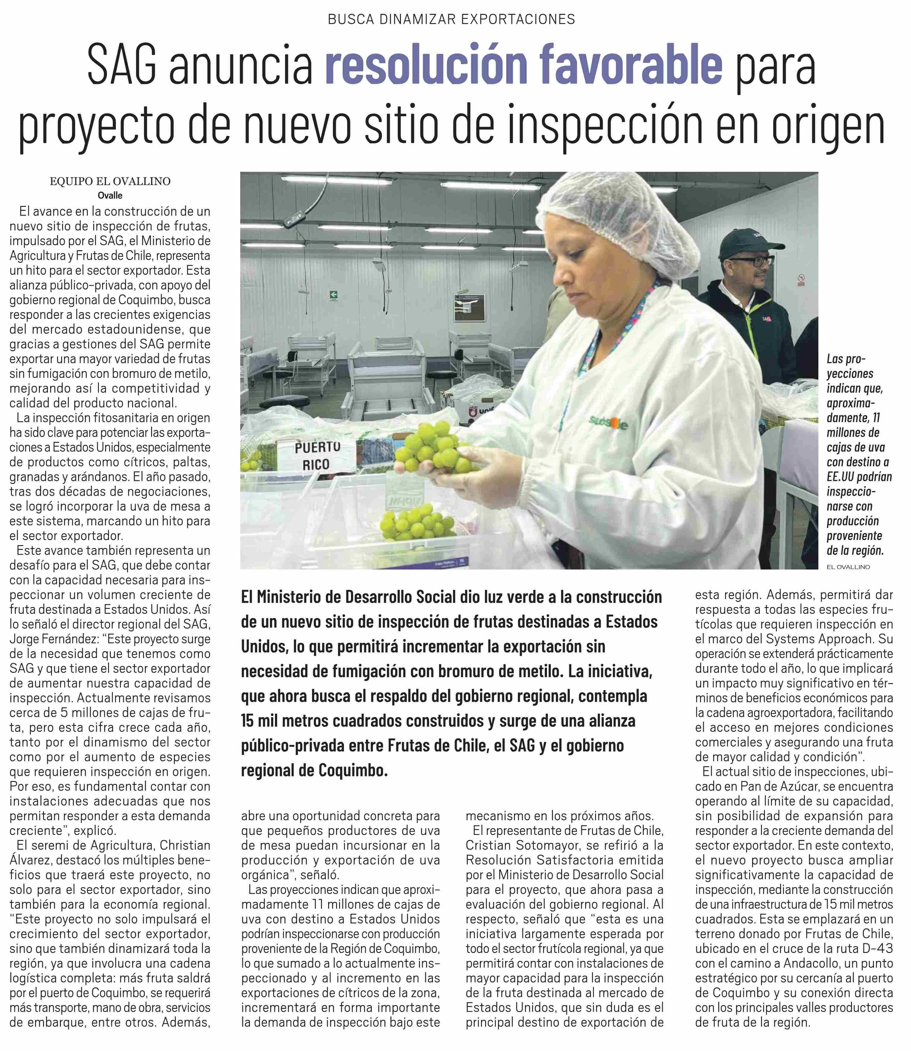 SAG anuncia resolución favorable para proyecto de nuevo sitio de inspección en origen 07-06-2025 El Ovallino |