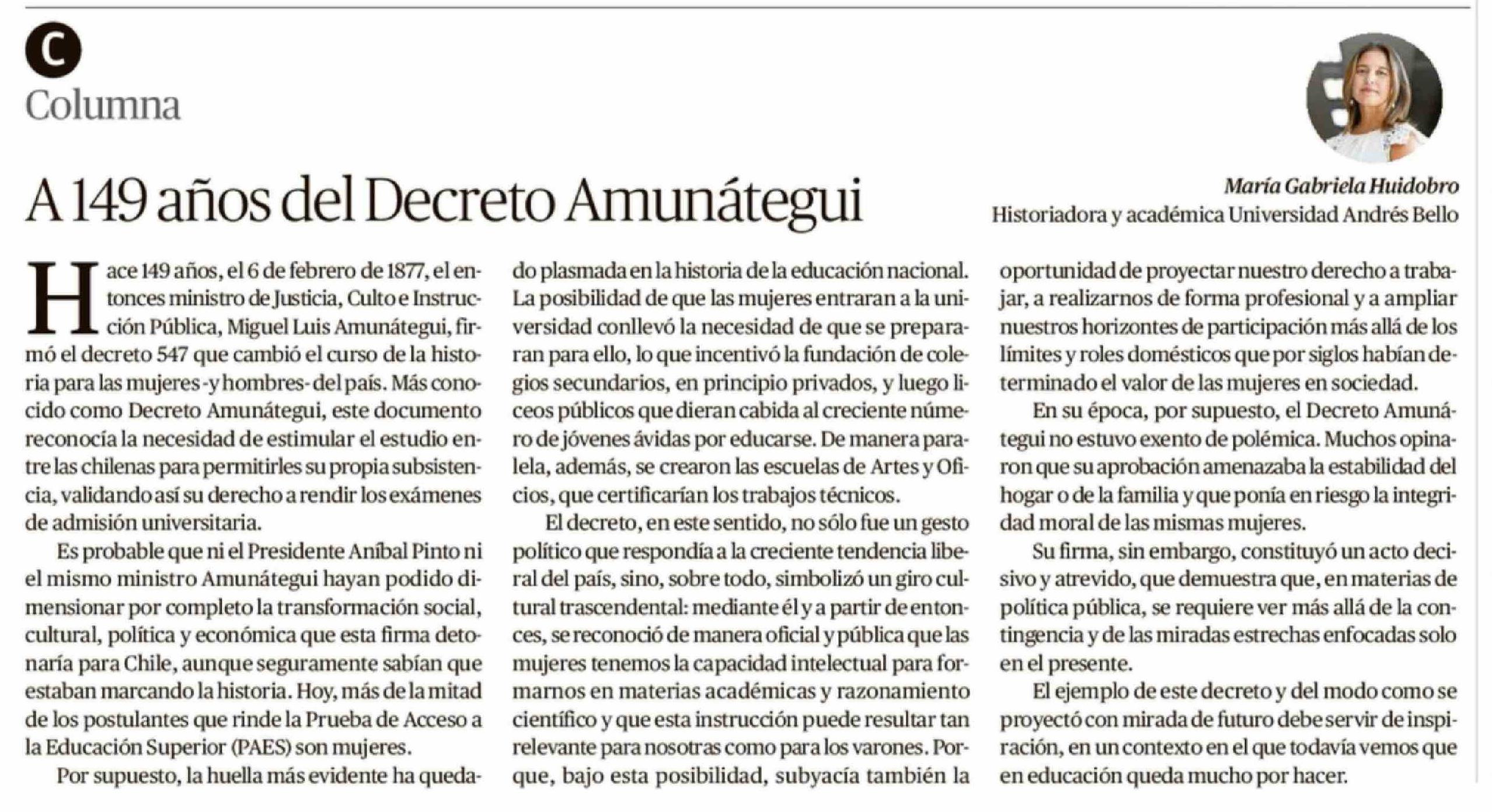 Título: Columnas de Opinión: A 149 años del Decreto Amunátegui
