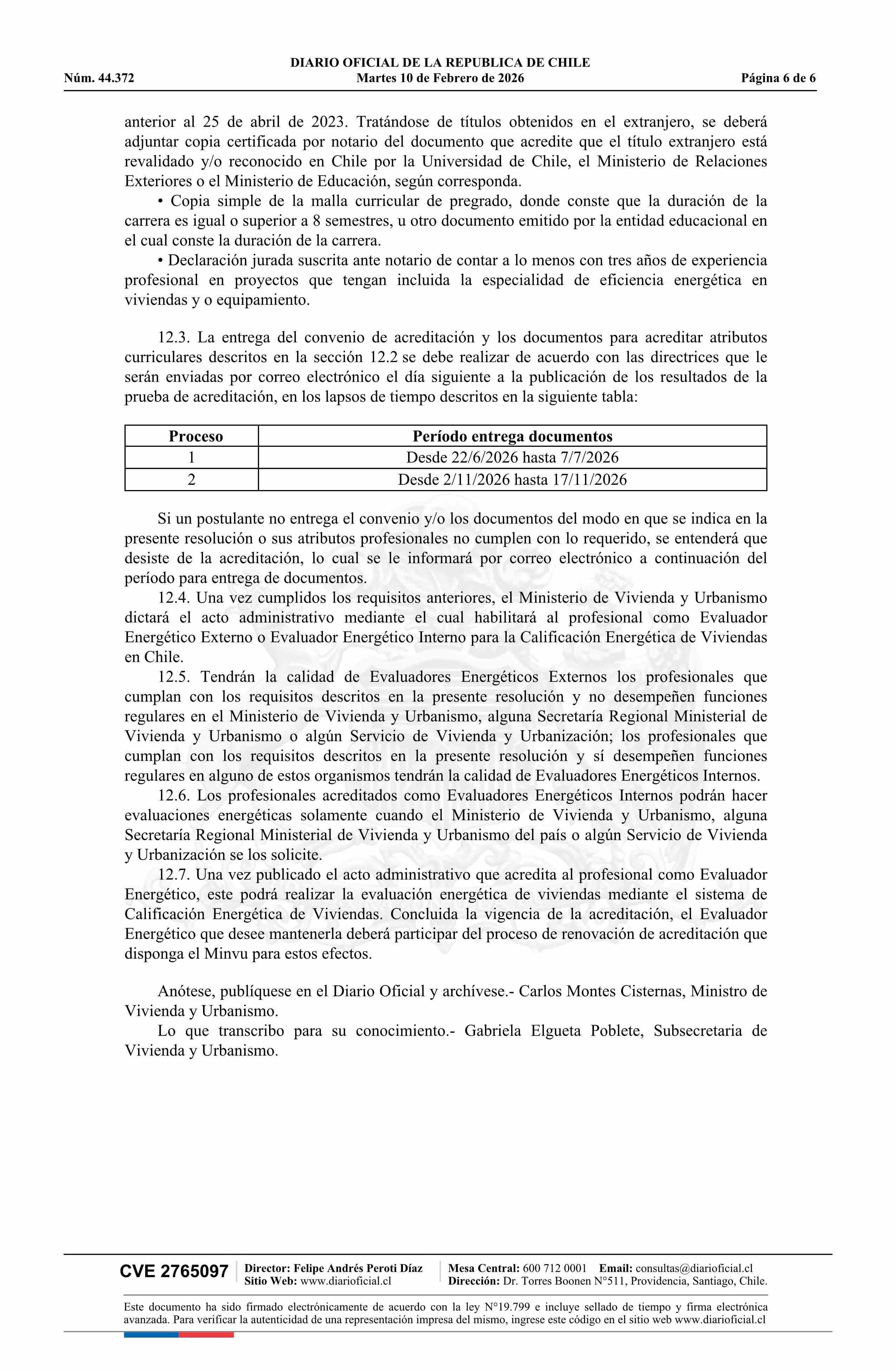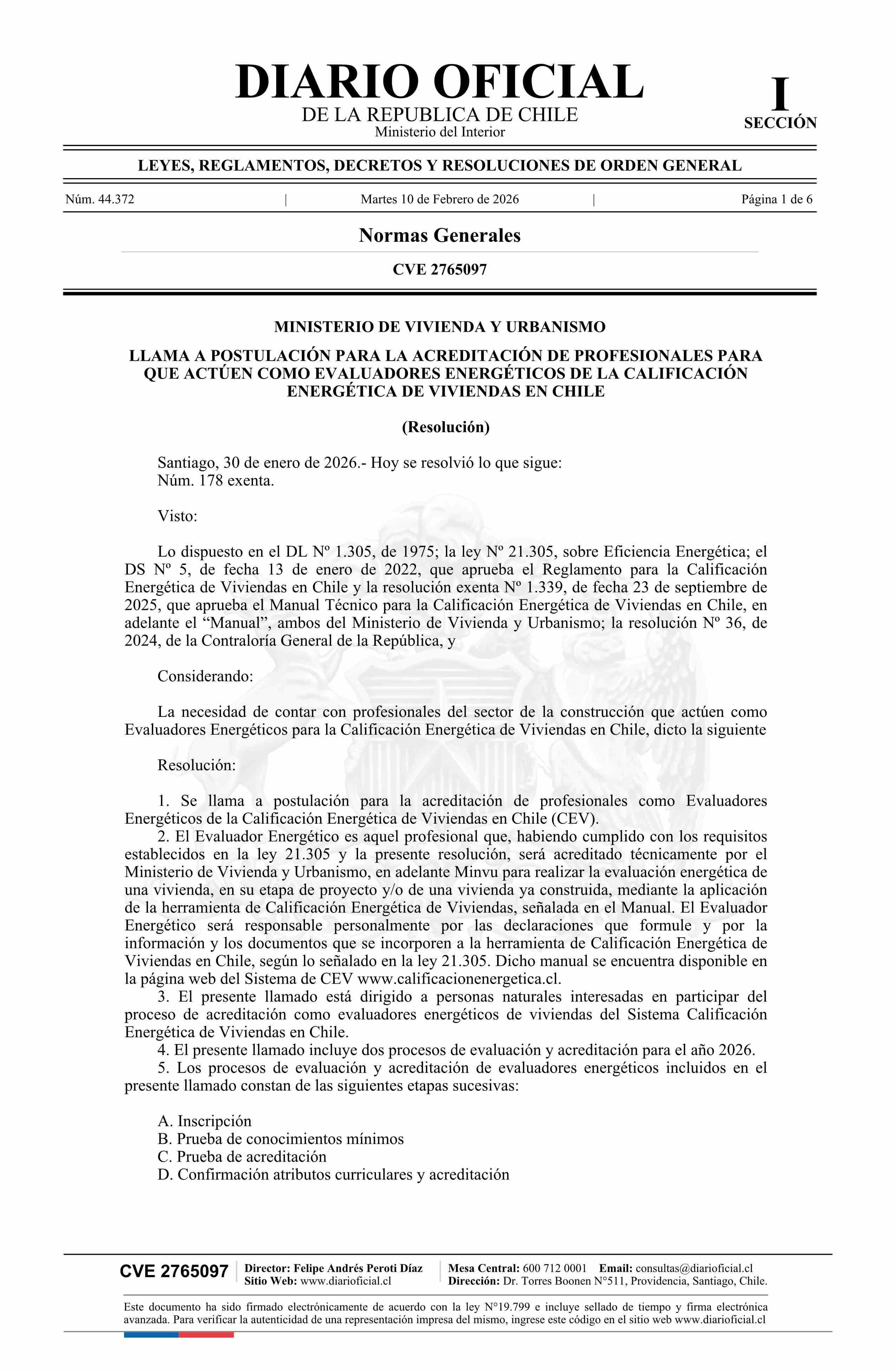 | Título: | Resolución exenta número 178, de 2026.- Llama a postulación para la acreditación de profesionales para que actúen como evaluadores energéticos de la calificación energética de viviendas en Chile |