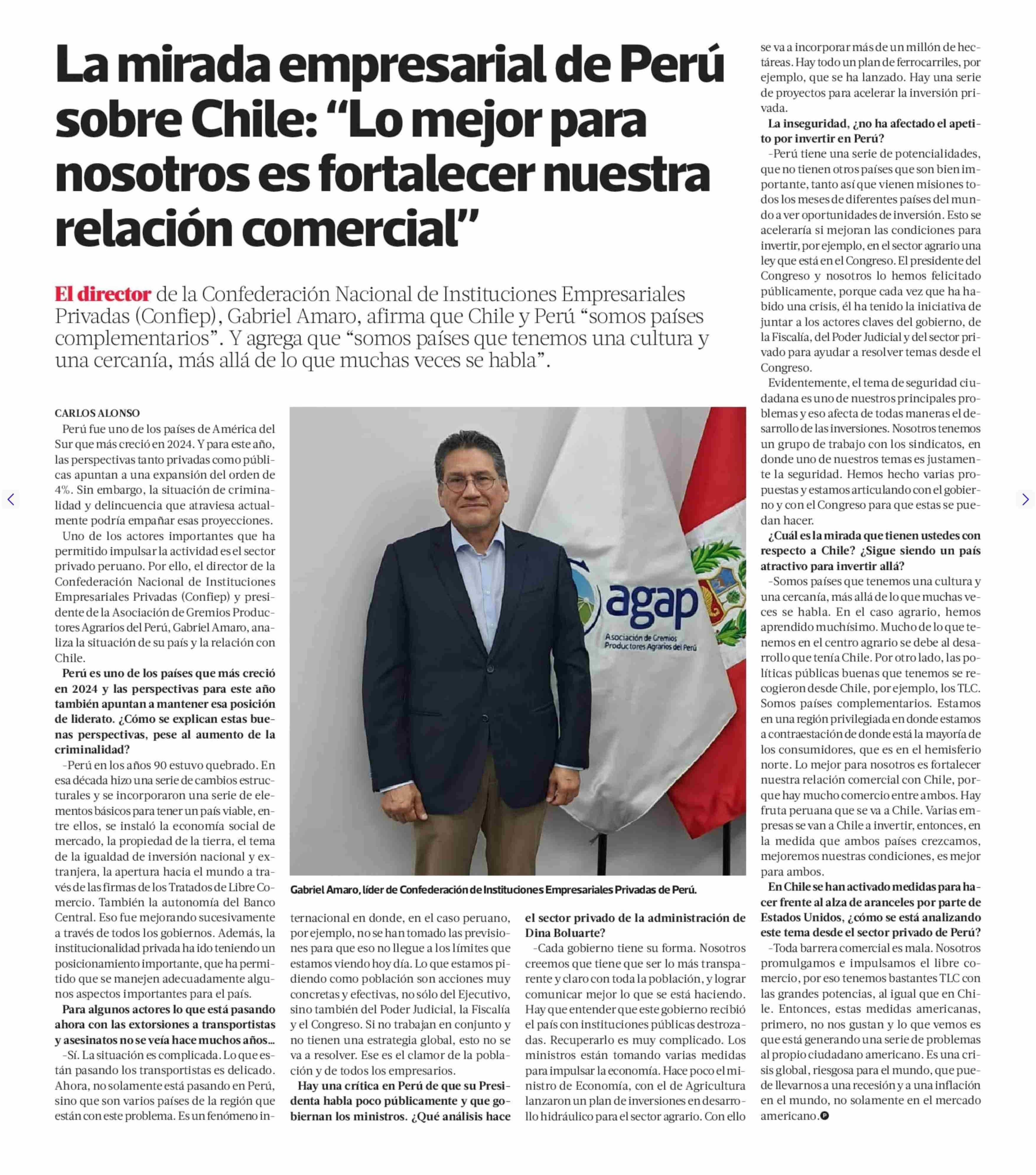 La mirada empresarial de Perú sobre Chile: “Lo mejor para nosotros es fortalecer nuestra relación comercial” 21-04-2025 La Tercera |