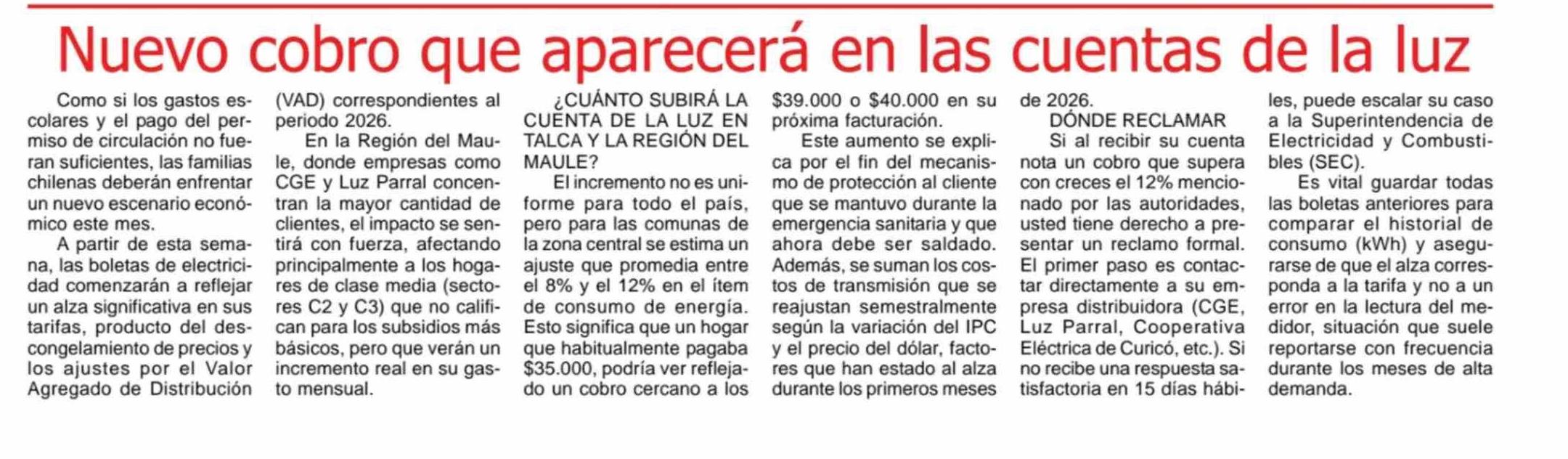 Nuevo cobro que aparecerá en las cuentas de la luz 04-03-2026 Maule Hoy |