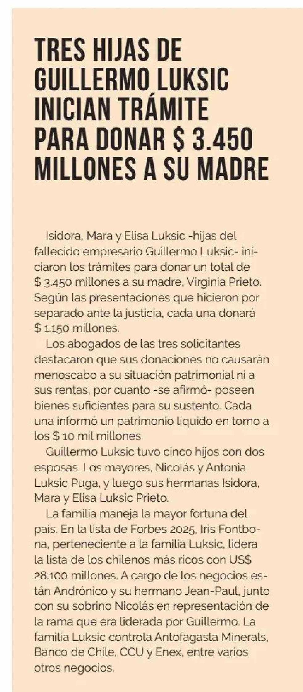 TRES HIJAS DE GUILLERMO LUKSIC INICIAN TRAMITE PARA DONAR $ 3.450 MILLONES A SU MADRE 01-06-2025 Diario Financiero |