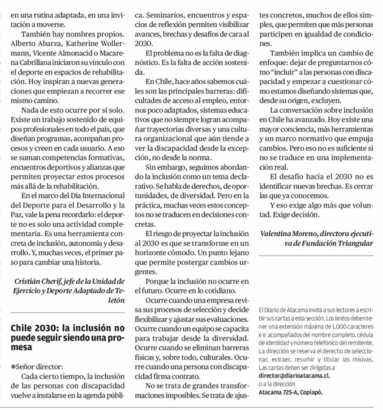 Cartas: Chile 2030: la inclusión no puede seguir siendo una promesa 09-04-2026 El Diario de Atacama |