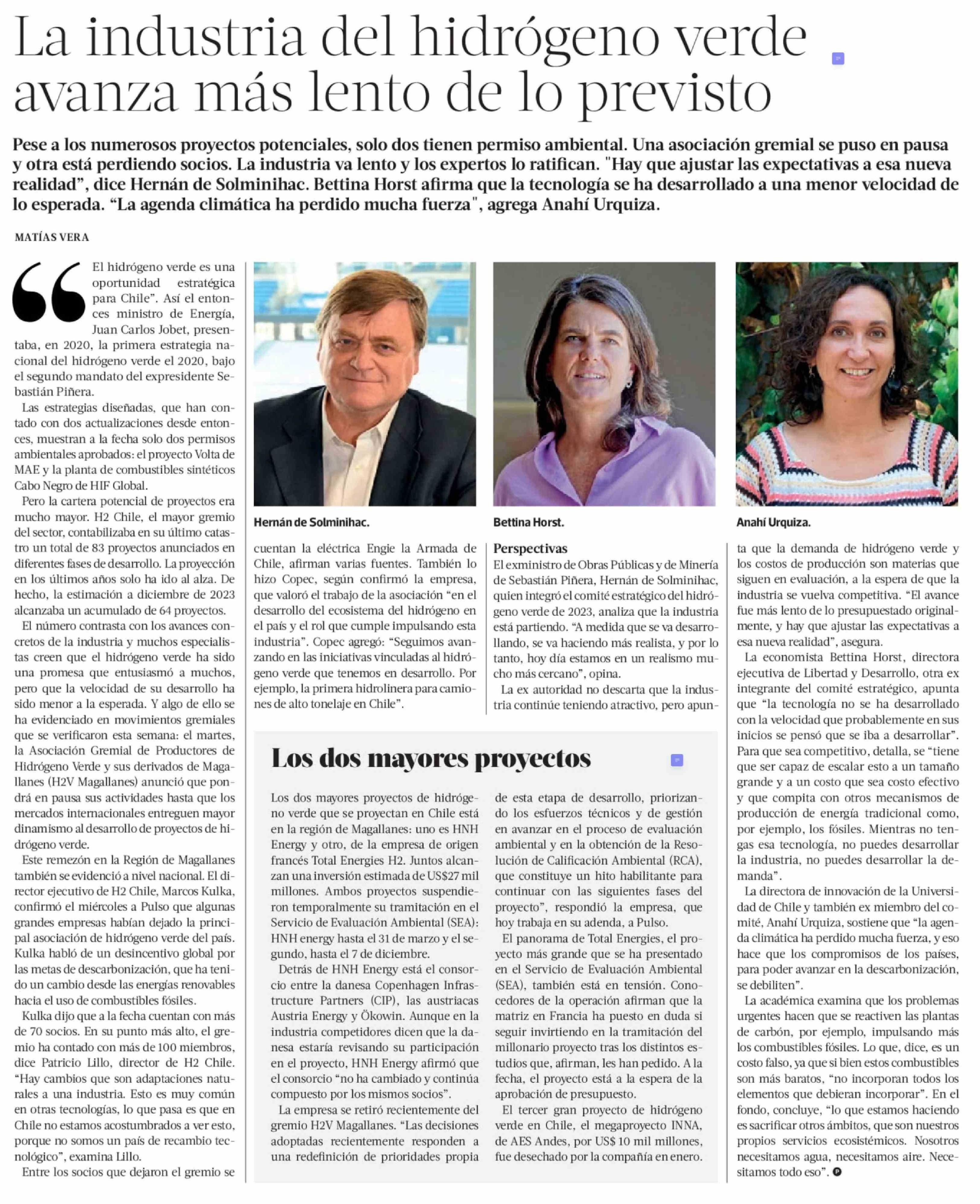 La industria del hidrógeno verde avanza más lento de lo previsto 07-03-2026 La Tercera |