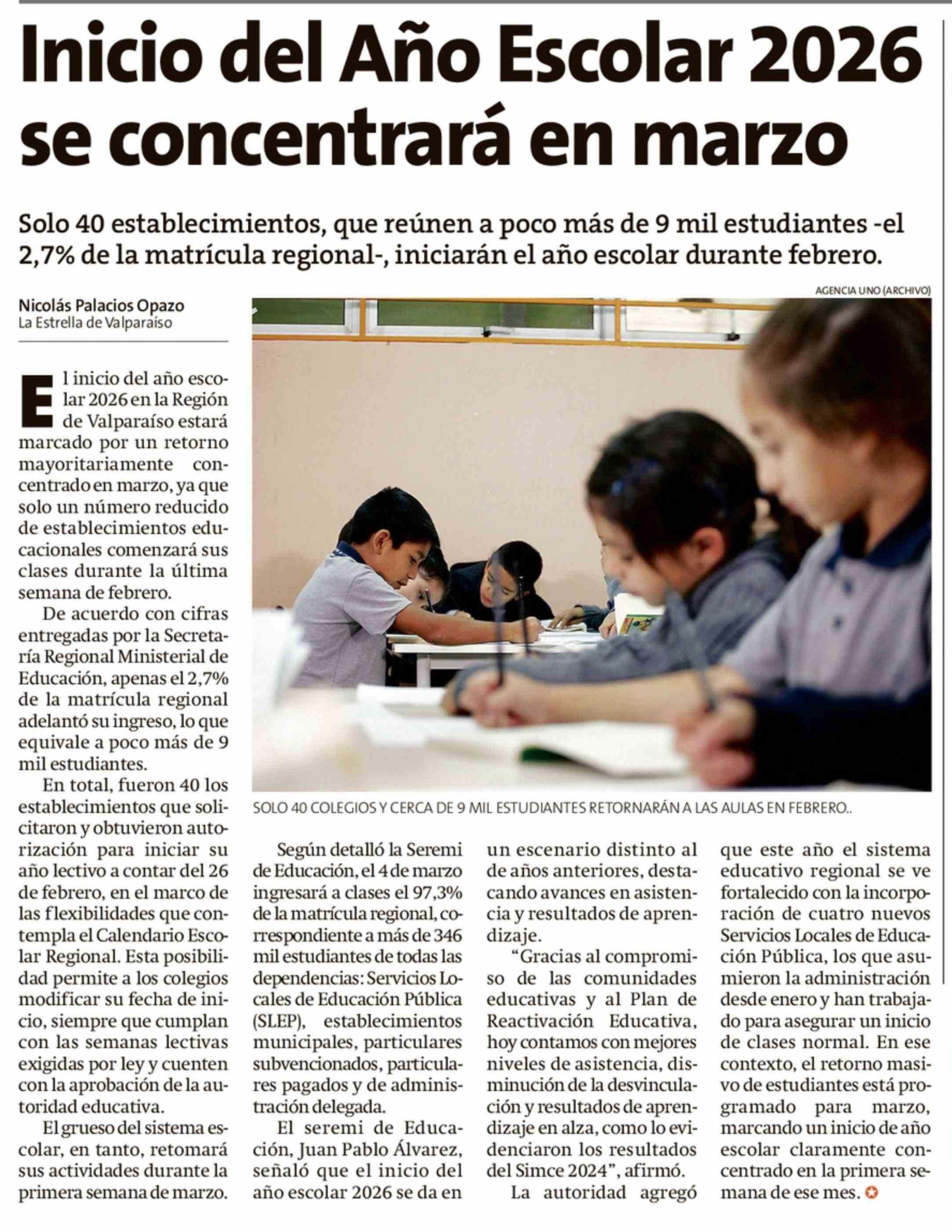 Inicio del Año Escolar 2026 se concentrará en marzo 07-02-2026 La Estrella de Valparaíso |