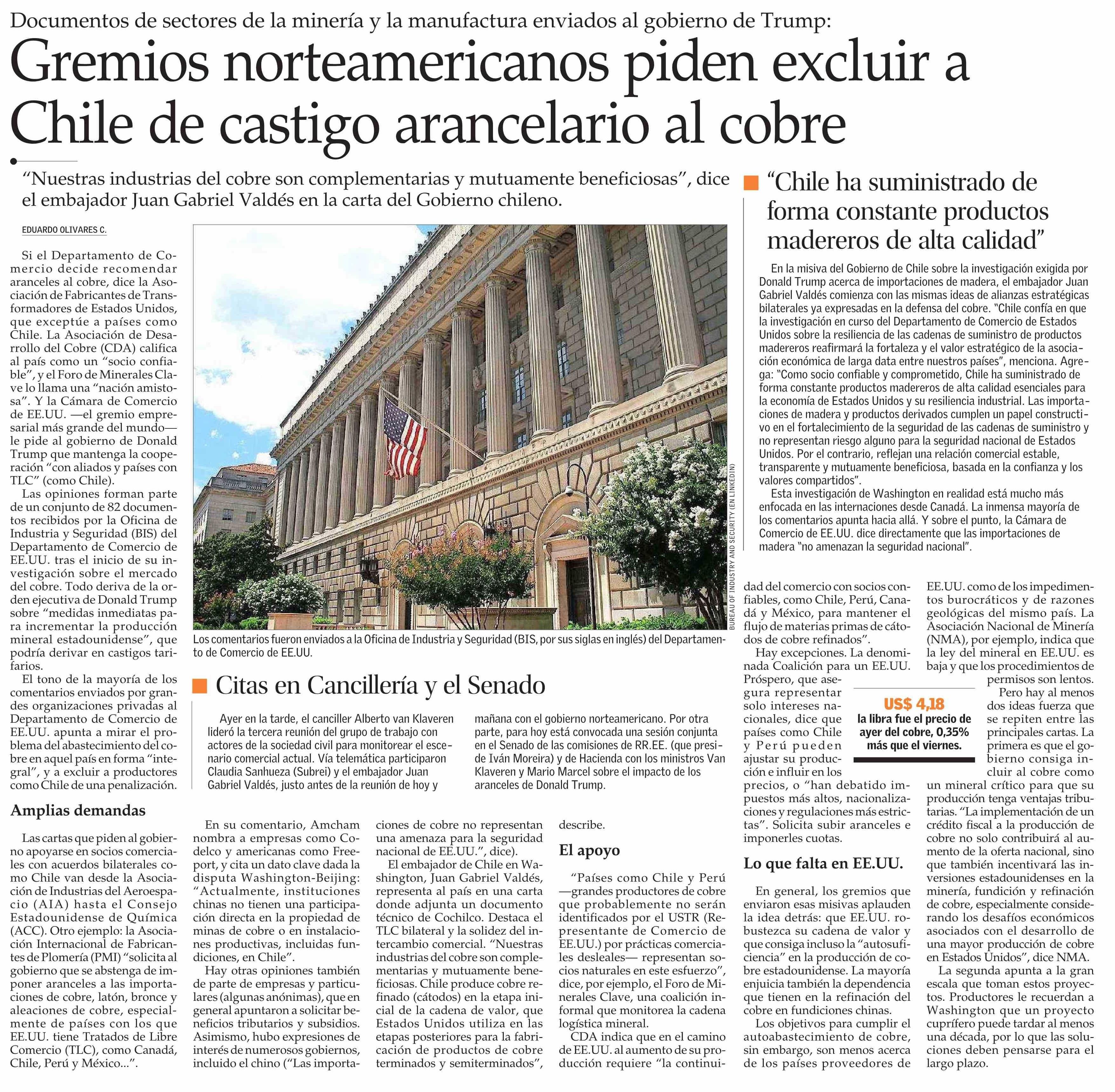 Gremios norteamericanos piden excluir a Chile de castigo arancelario al cobre 15-04-2025 El Mercurio |