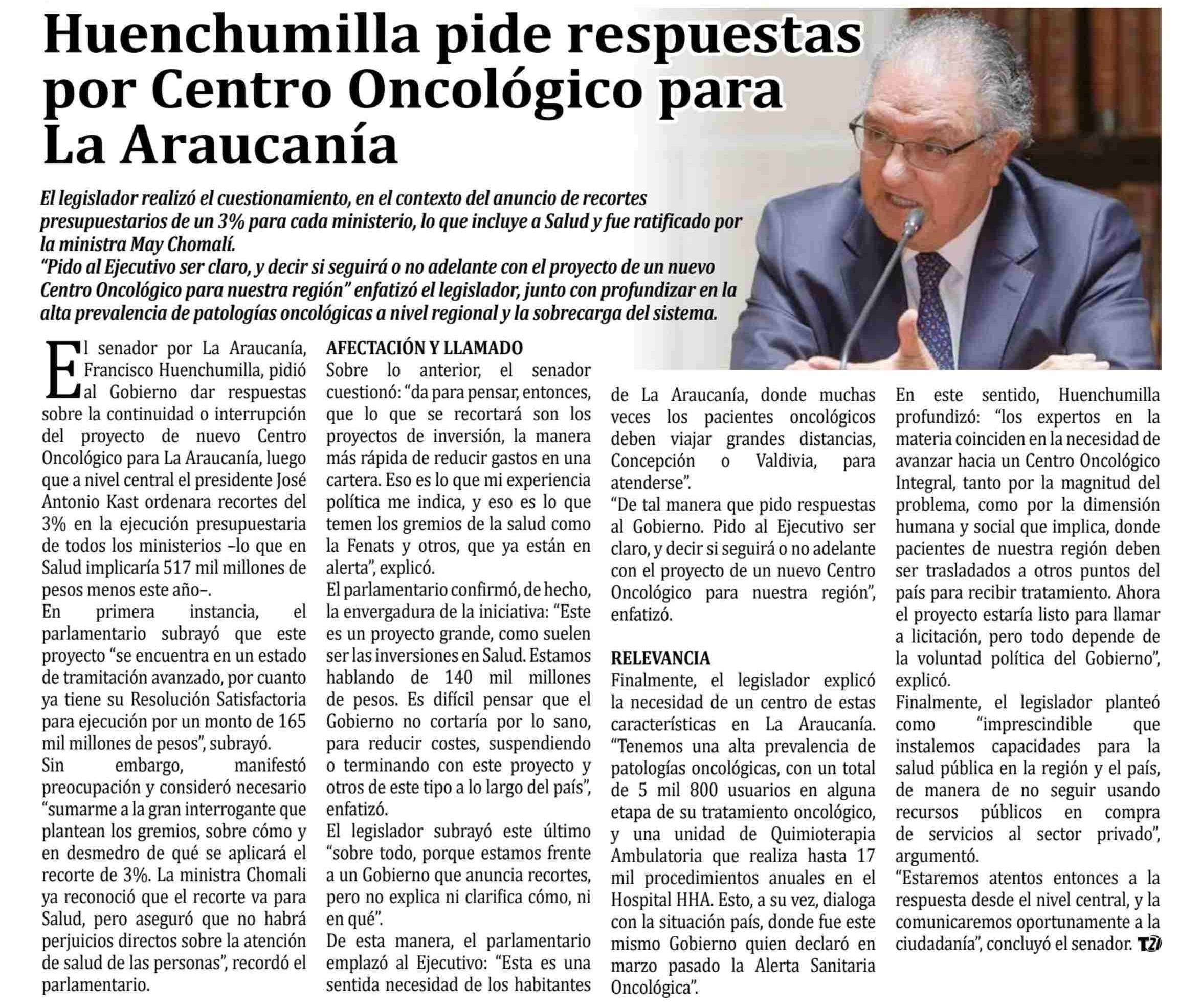 | Título: | Huenchumilla pide respuestas por Centro Oncológico para La Araucanía |