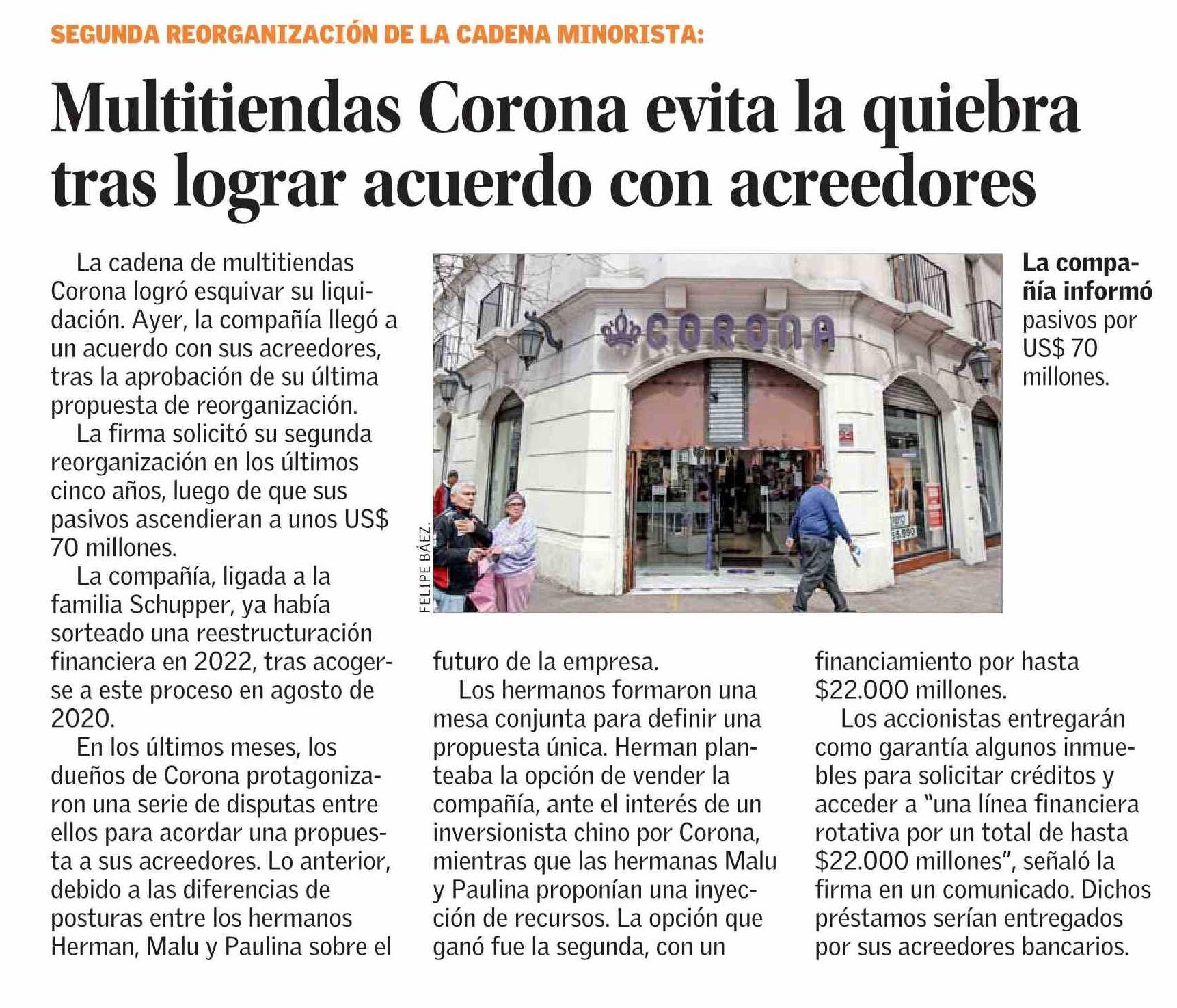 Multitiendas Corona evita la quiebra tras lograr acuerdo con acreedores 06-06-2025 El Mercurio |