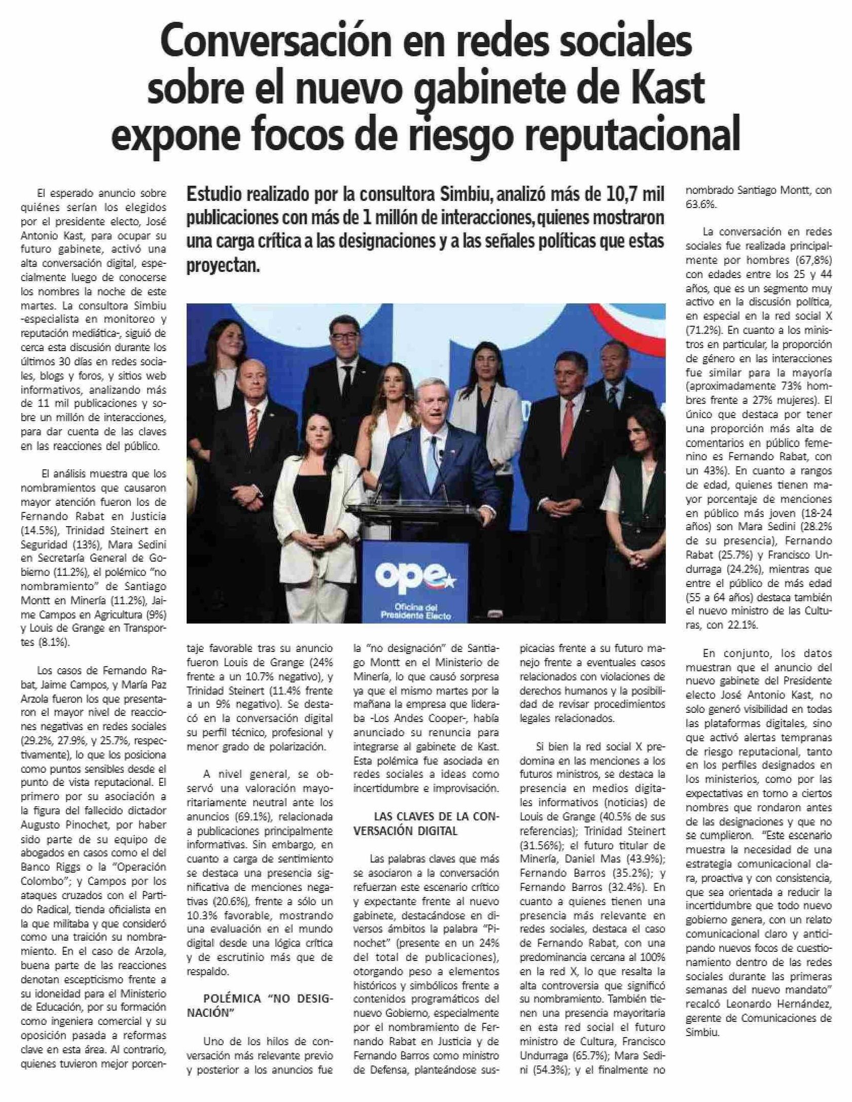 | Título: | Conversación en redes sociales sobre el nuevo gabinete de Kast expone focos de riesgo reputacional |