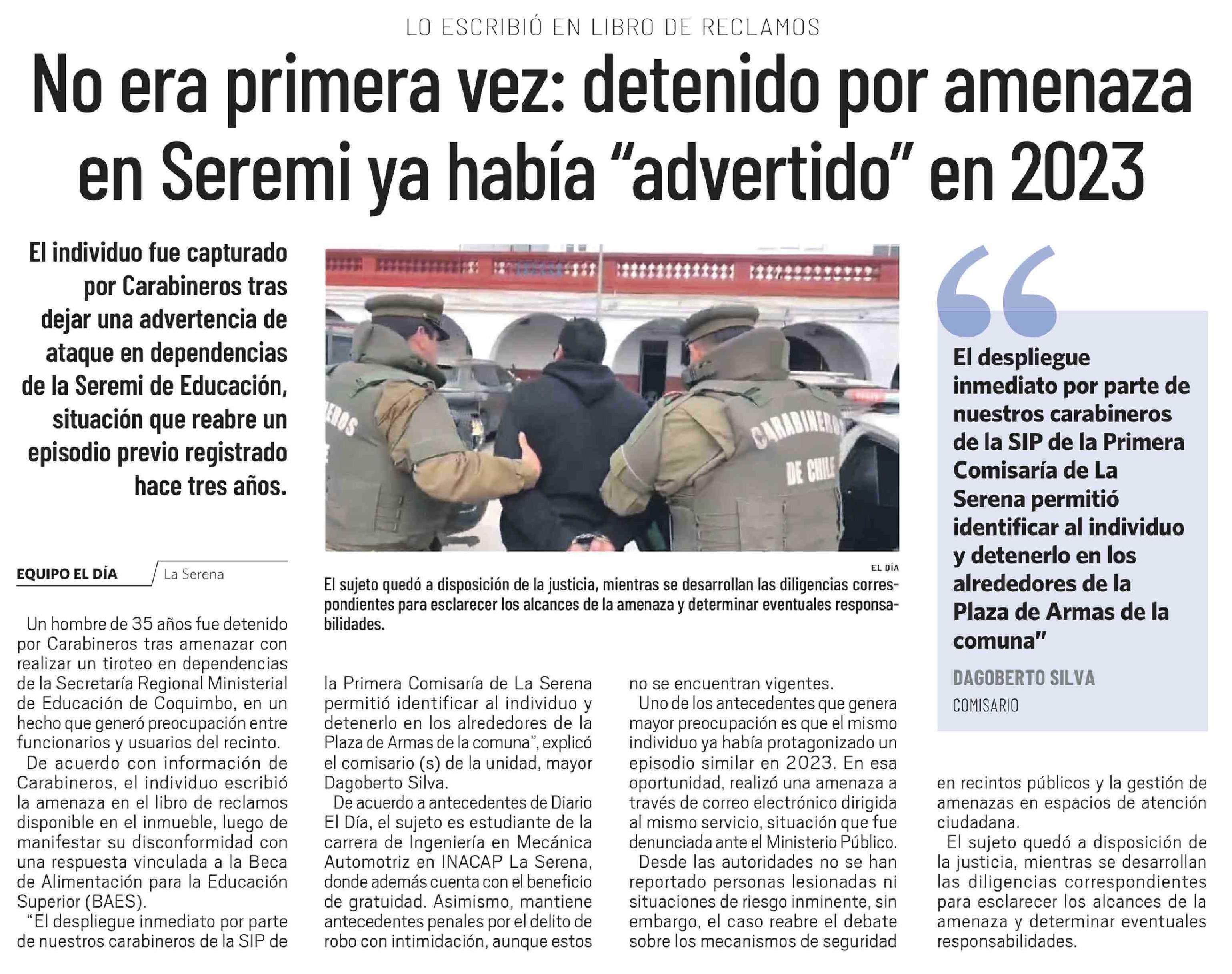 | Título: | No era primera vez: detenido por amenaza en Seremi ya había "advertido" en 2023 |