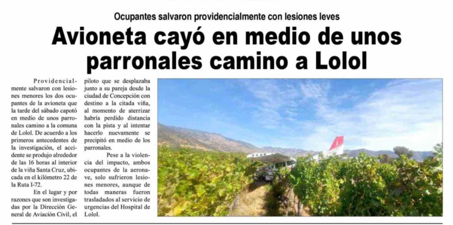 | Título: | Avioneta cayó en medio de unos parronales camino a Lolol |