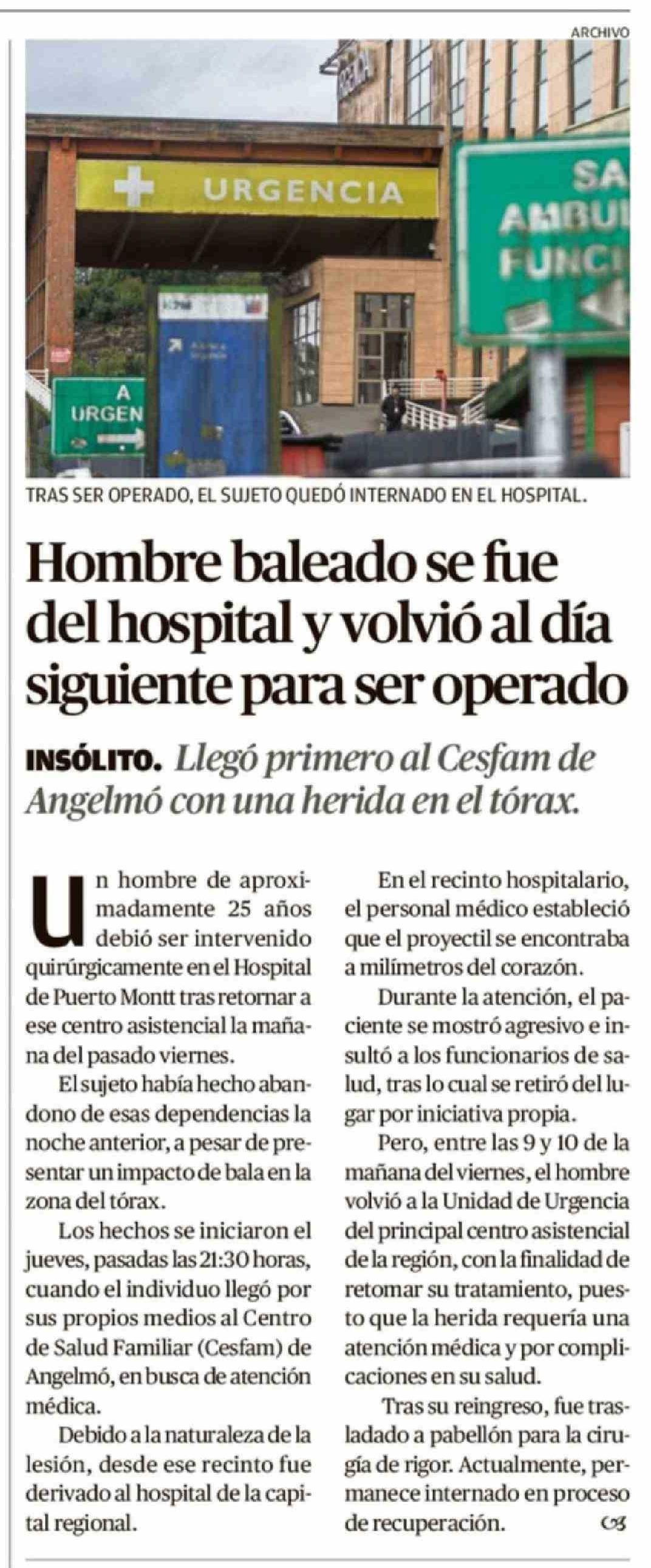 Hombre baleado se fue del hospital y volvió al día siguiente para ser operado 15-03-2026 El Llanquihue |