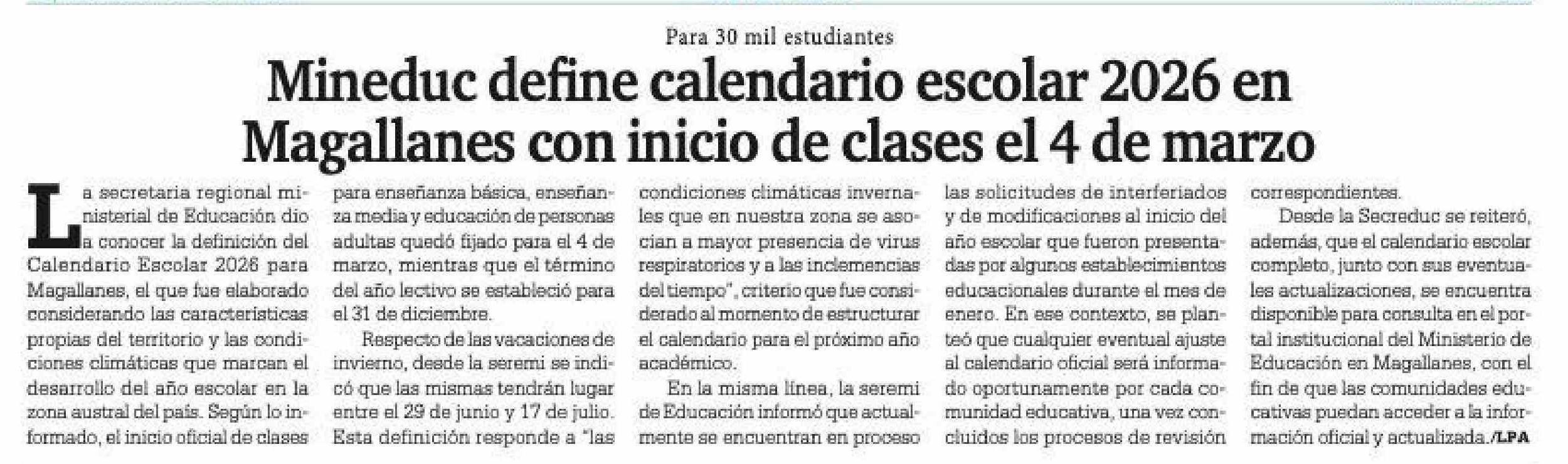 | Título: | Mineduc define calendario escolar 2026 en Magallanes con inicio de clases el 4 de marzo |