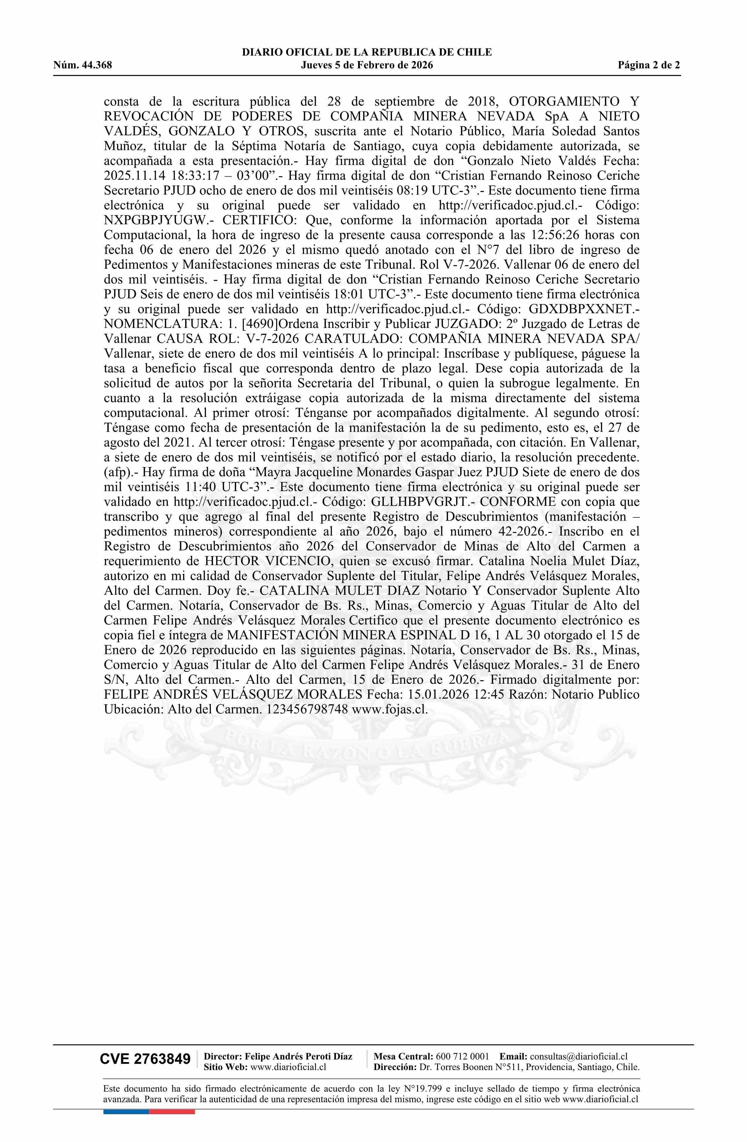 ESPINAL D 16, 1 AL 30 / Compañía Minera Nevada SpA 05-02-2026 DIARIO OFICIAL CHILE - BOLETÍN OFICIAL DE MINERÍA |