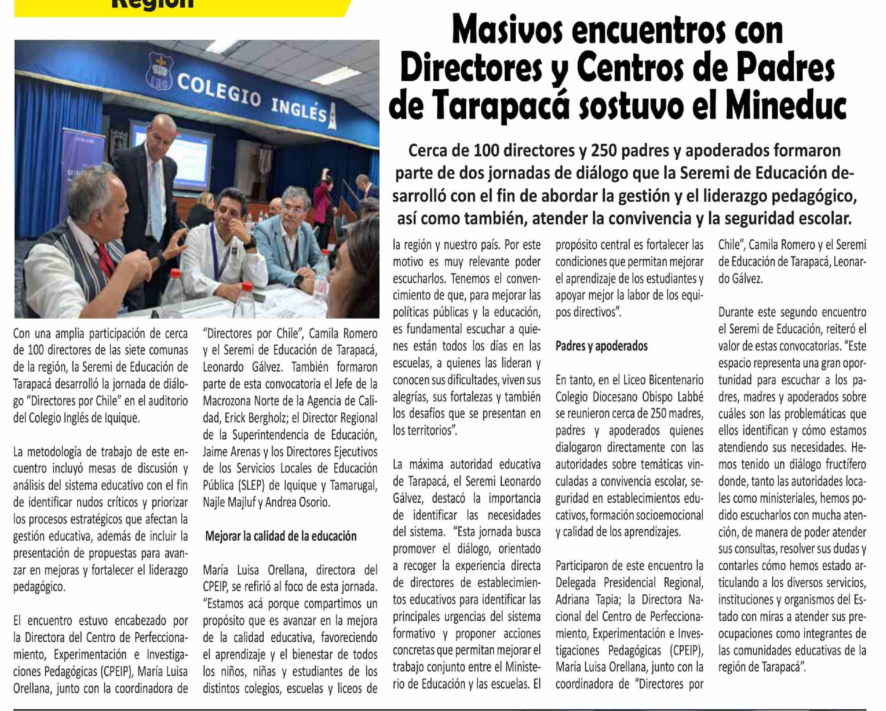 | Título: | Masivos encuentros con Directores y Centros de Padres de Tarapacá sostuvo el Mineduc |