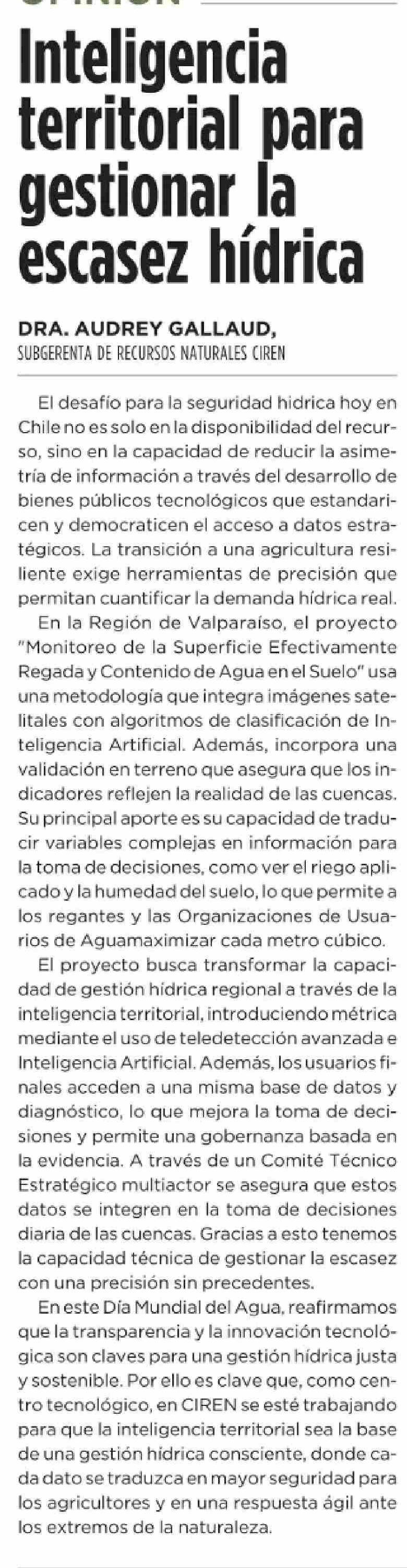 Columnas de Opinión: Inteligencia territorial para gestionar la escasez hídrica 23-03-2026 El Mercurio |