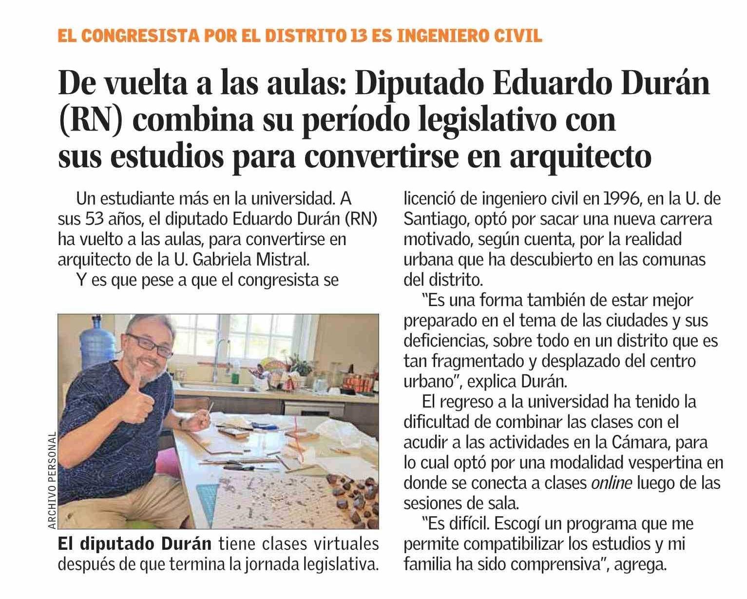 De vuelta a las aulas: Diputado Eduardo Durán (RN) combina su período legislativo con sus estudios para convertirse en arquitecto 14-06-2025 El Mercurio |