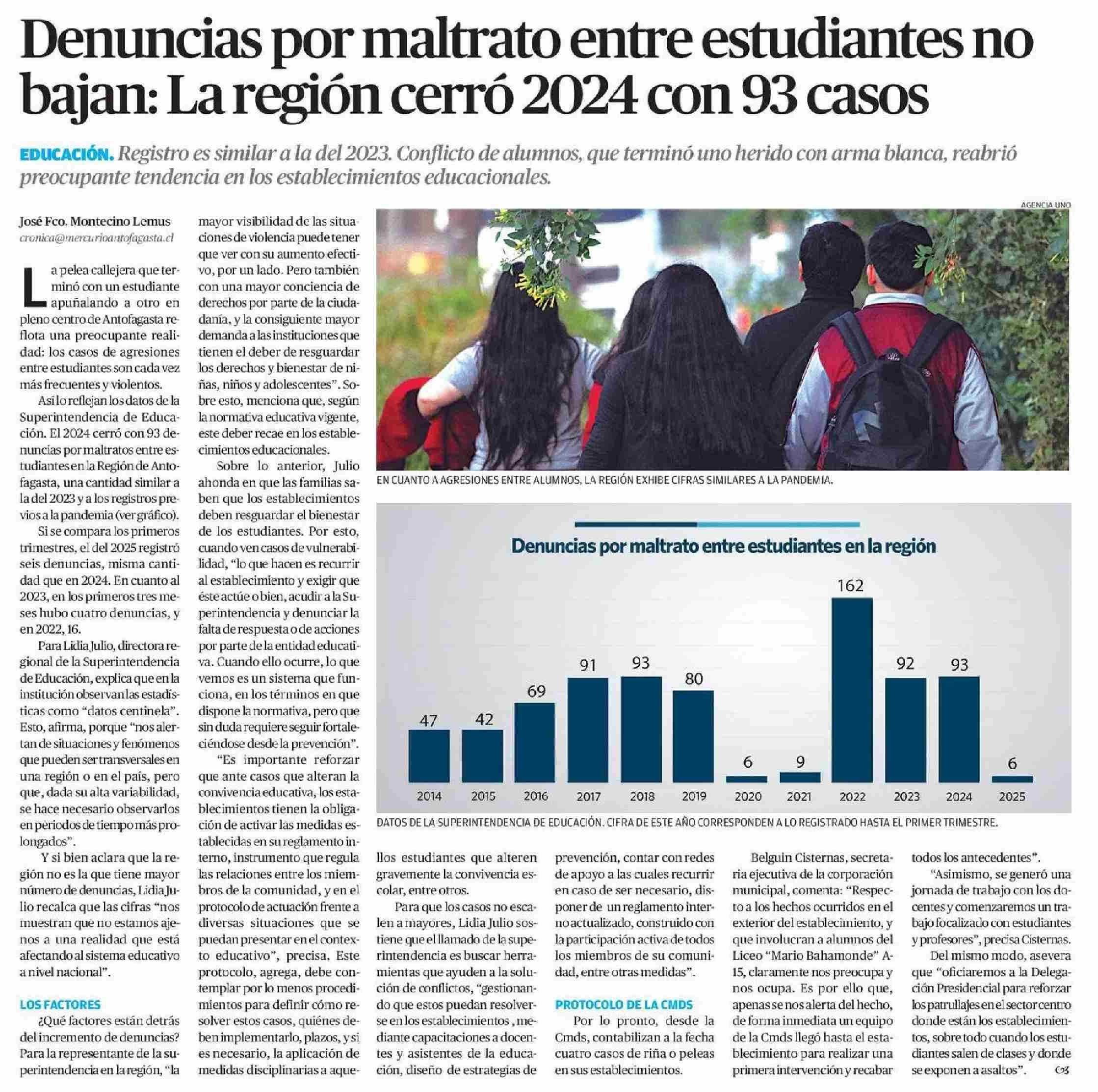 Denuncias por maltrato entre estudiantes no bajan: La región cerró 2024 con 93 casos 15-05-2025 El Mercurio de Antofagasta |