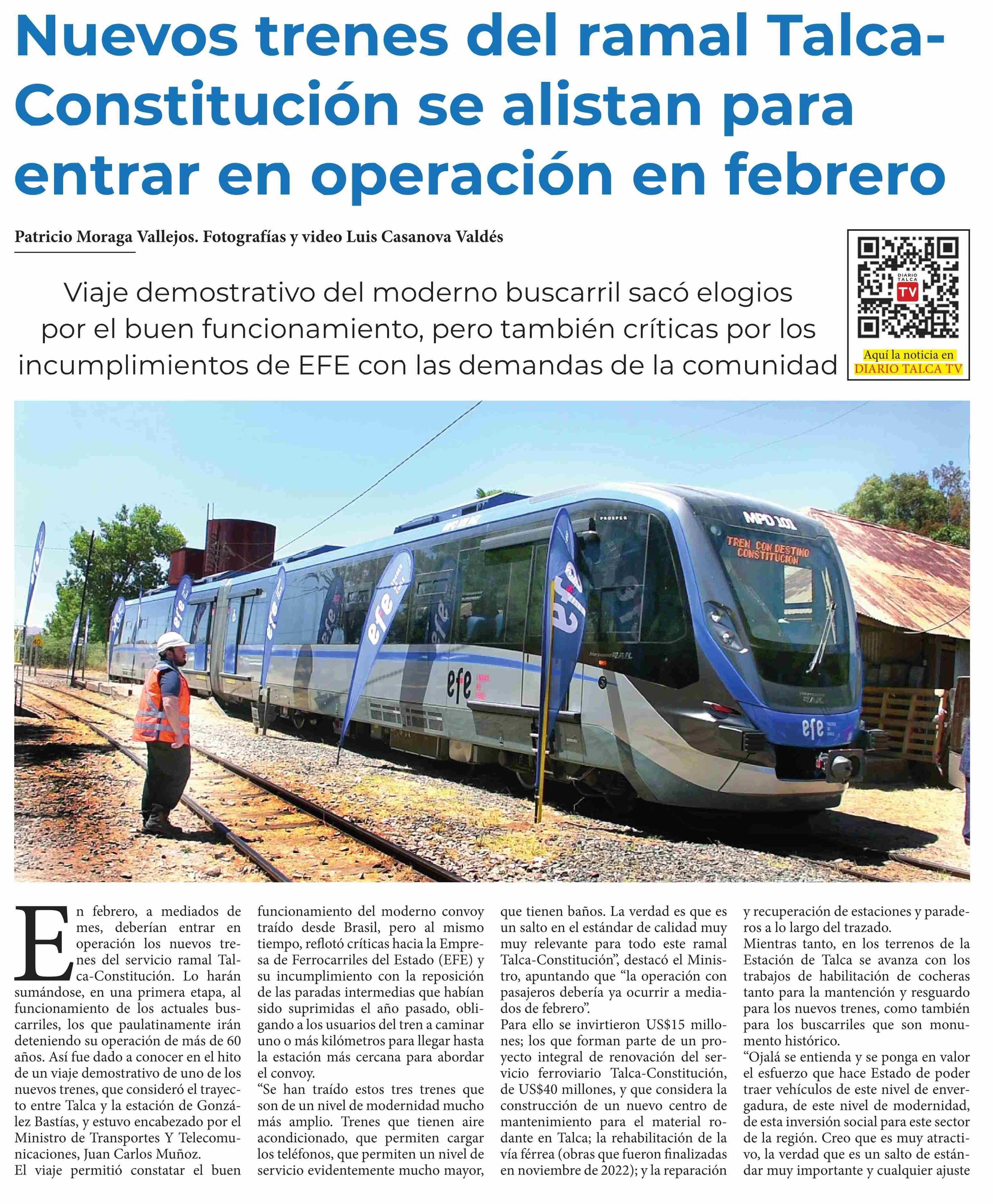 Título: Nuevos trenes del ramal TalcaConstitución se alistan para entrar en operación en febrero