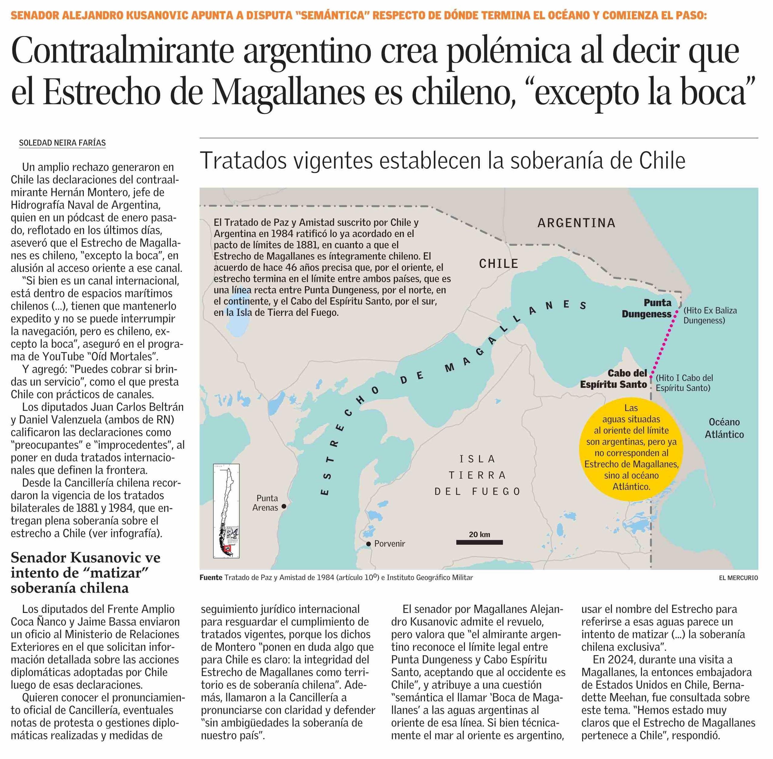 Contraalmirante argentino crea polémica al decir que el Estrecho de Magallanes es chileno, “excepto la boca” 16-04-2026 El Mercurio |