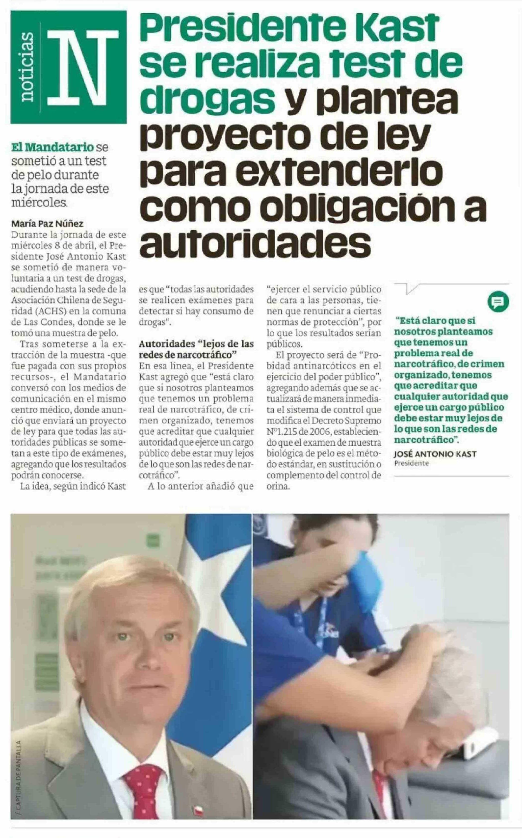 Título: Presidente Kast se realiza test de drogas y plantea proyecto de ley para extenderlo como obligación a autoridades