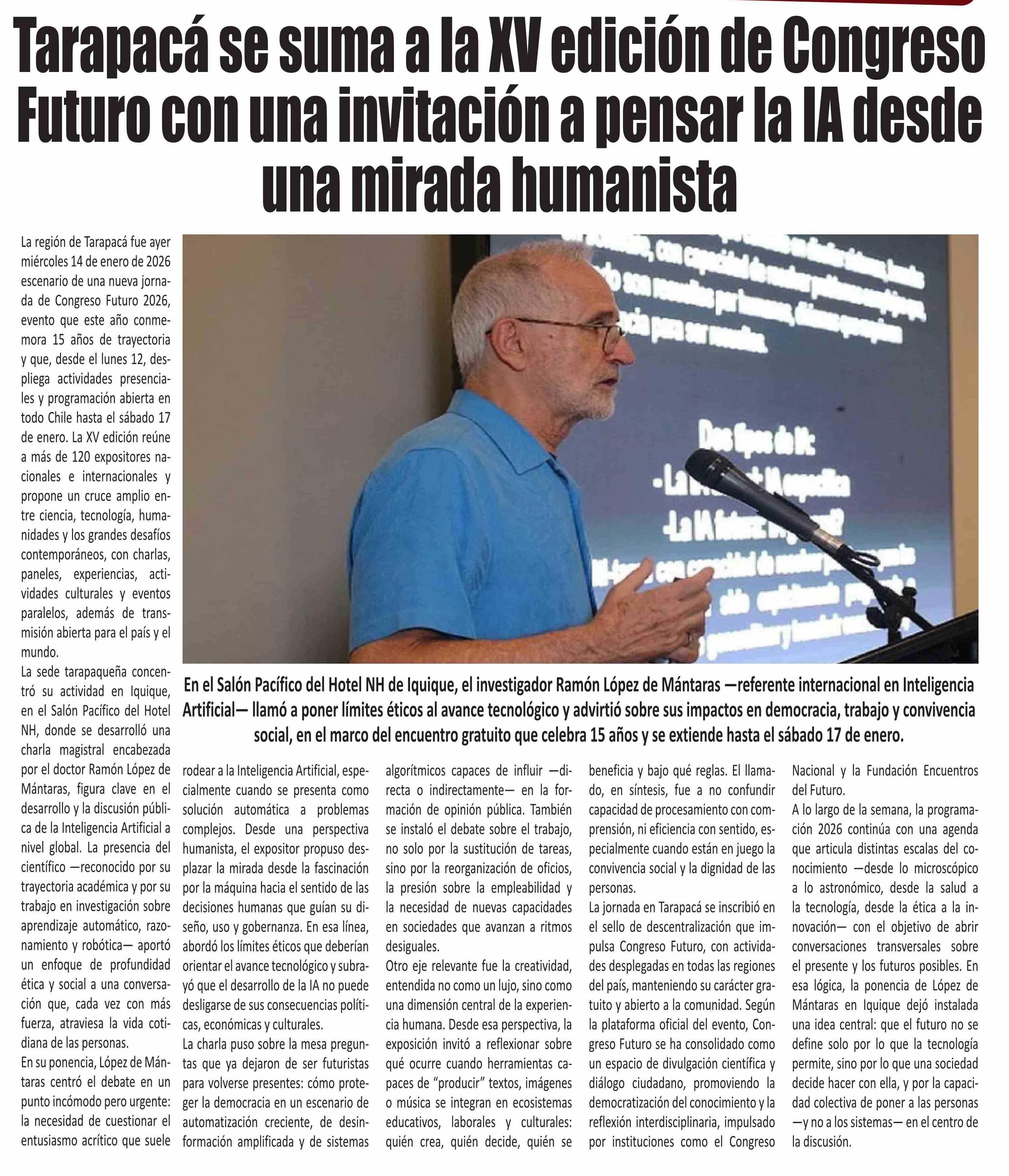 Título: Tarapacá se suma a la XV edición de Congreso Futuro con una invitación a pensar la IA desde una mirada humanista