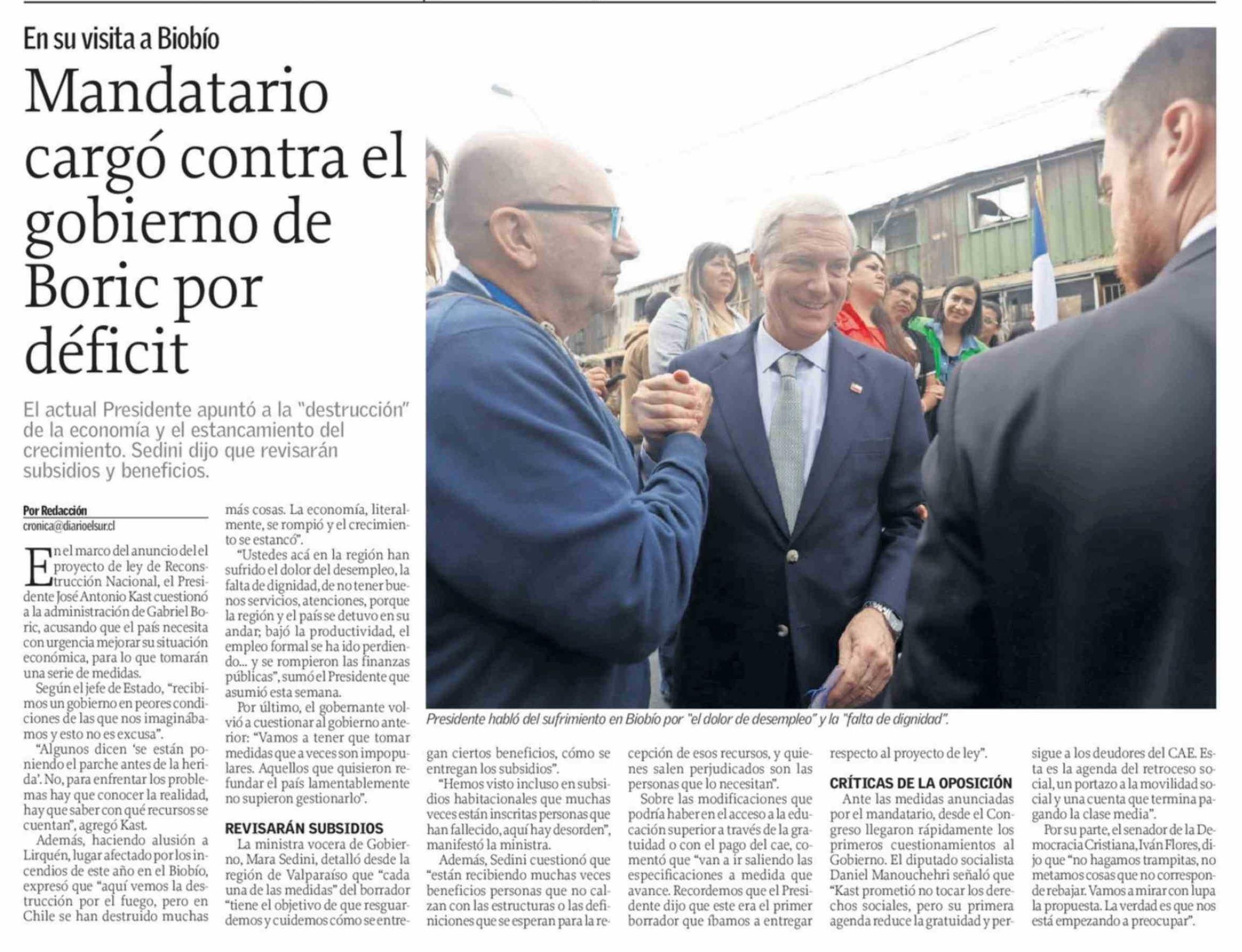 Mandatario cargó contra el gobierno de Boric por déficit 15-03-2026 El Sur |