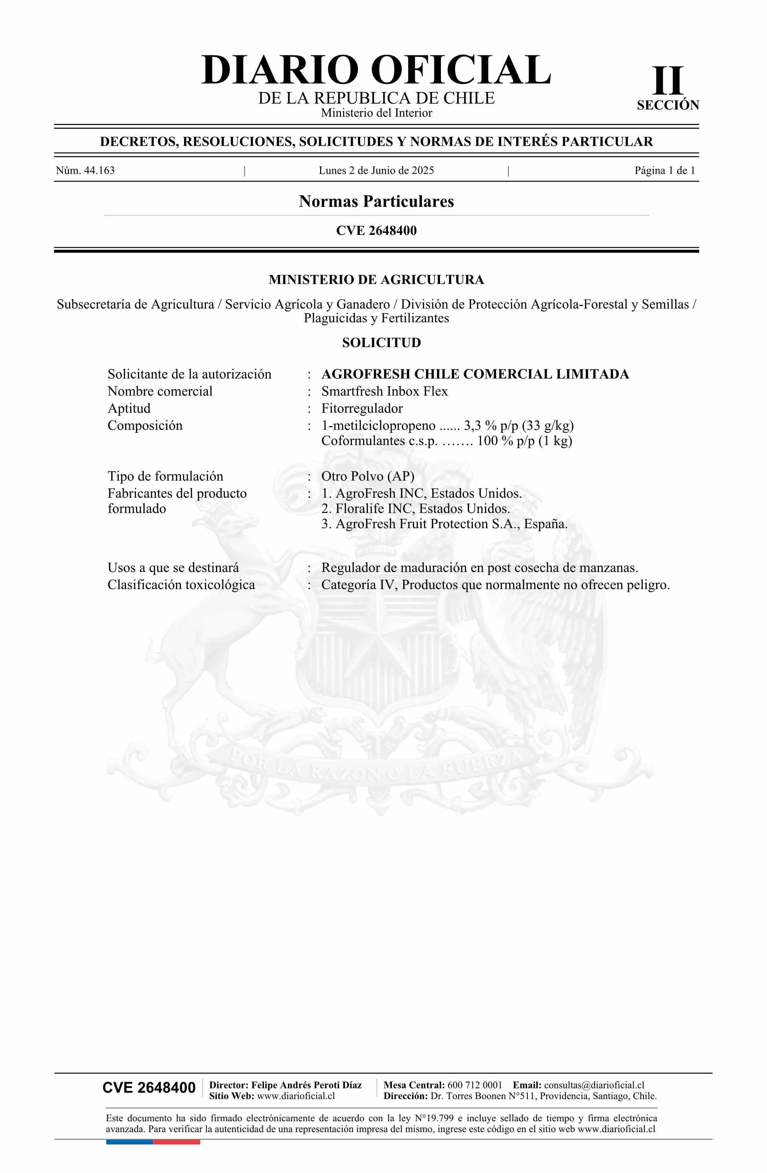 Solicitud Agrofresh Chile Comercial Limitada 02-06-2025 Diario Oficial Edición Electrónica |