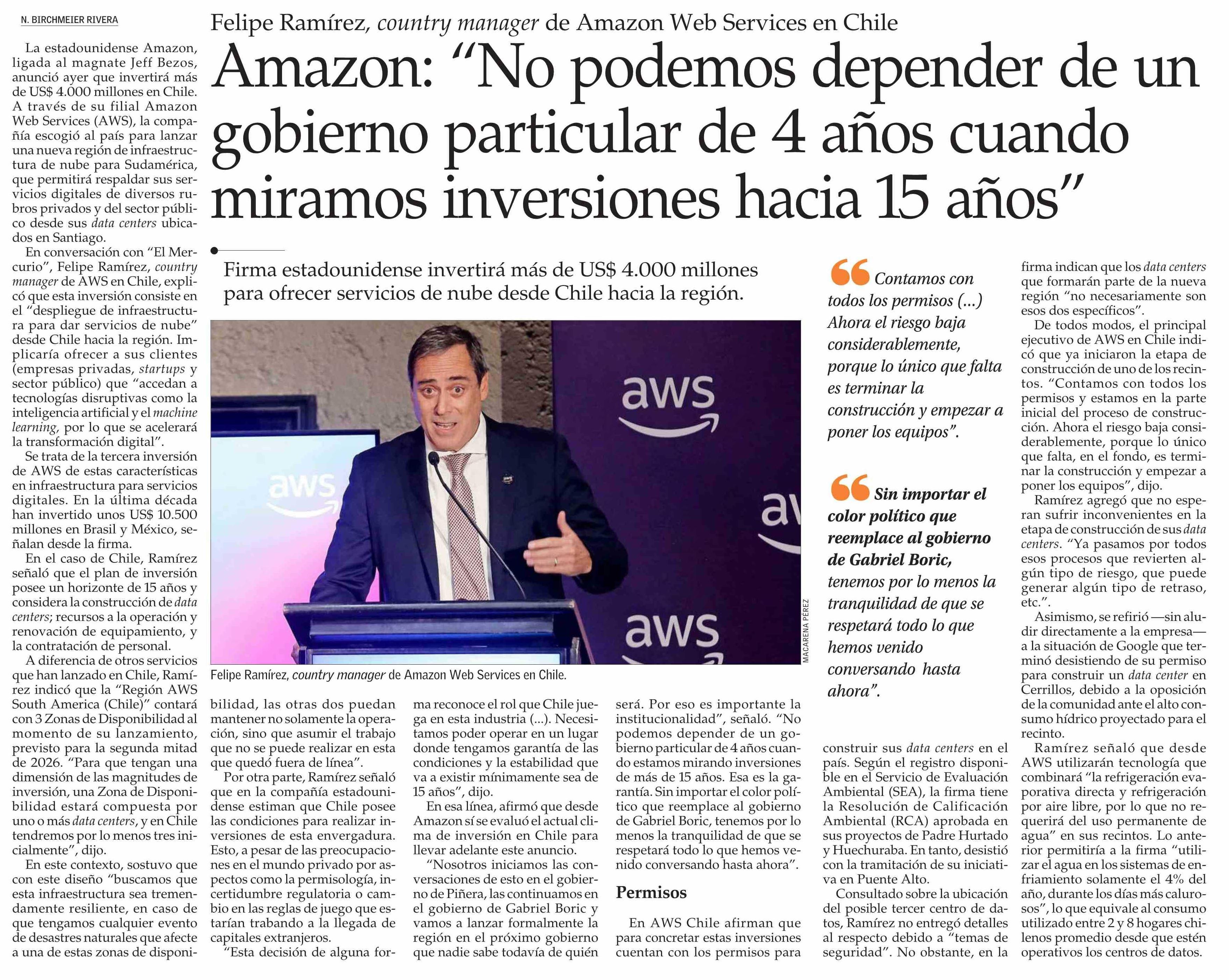 Amazon: “No podemos depender de un gobierno particular de 4 años cuando miramos inversiones hacia 15 años” 08-05-2025 El Mercurio |