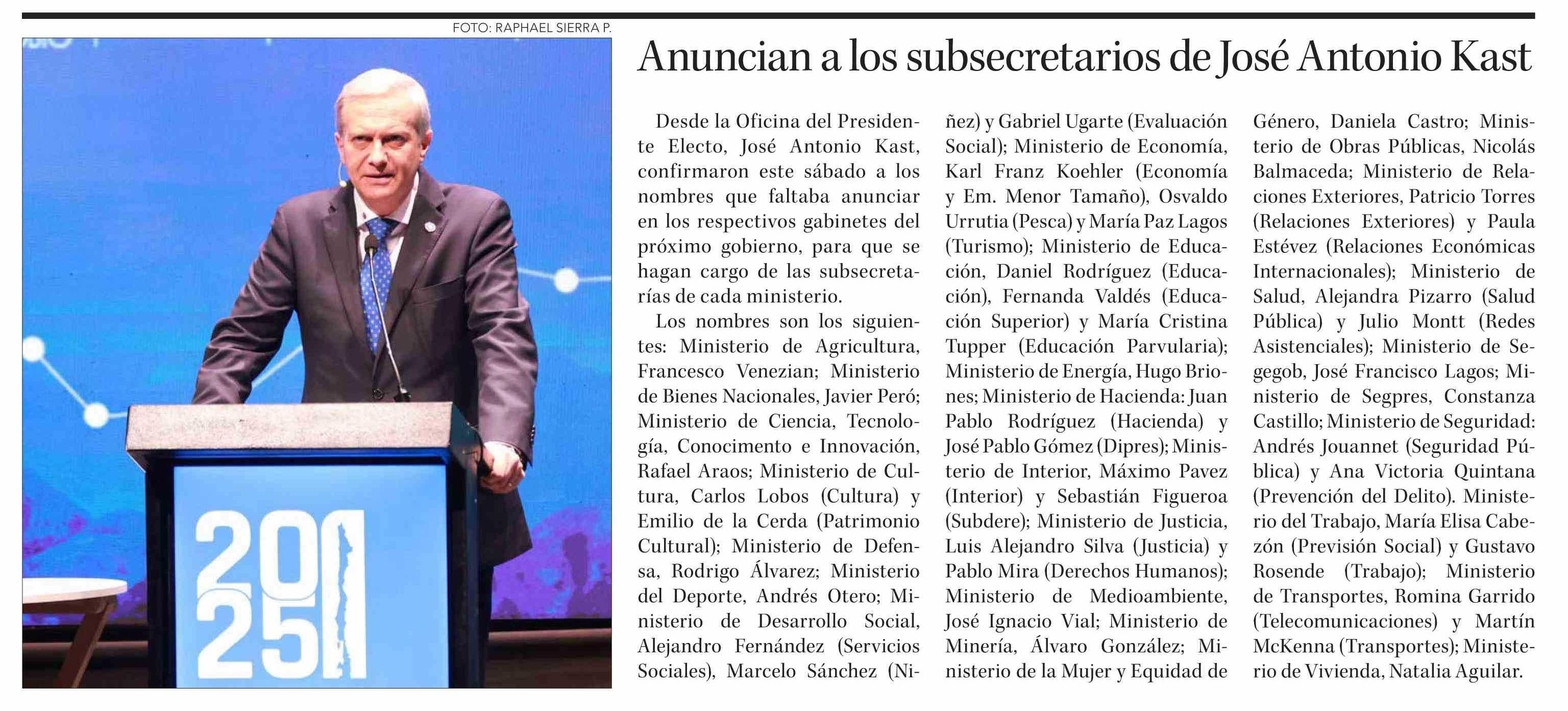 Título: Anuncian a los subsecretarios de José Antonio Kast