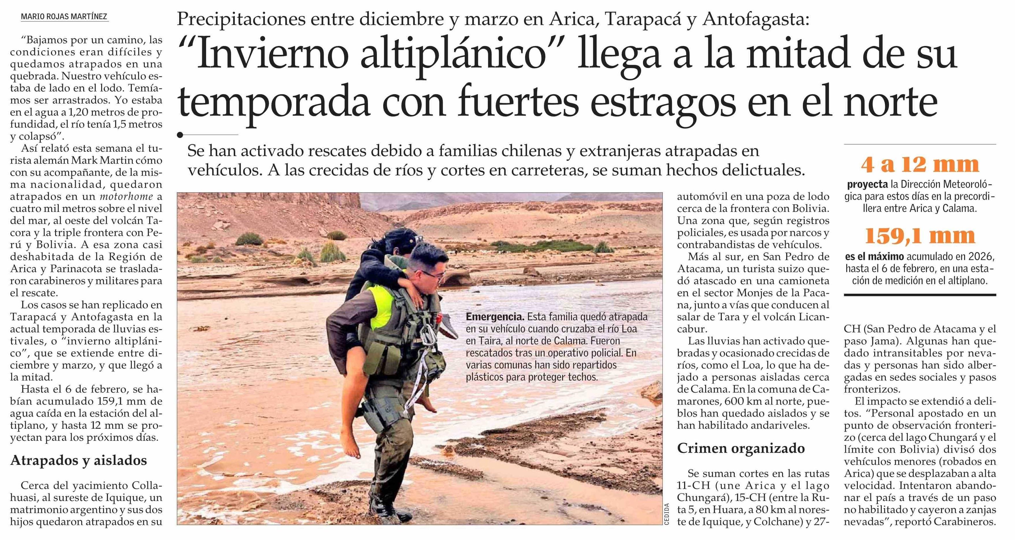 “Invierno altiplánico” llega a la mitad de su temporada con fuertes estragos en el norte 09-02-2026 El Mercurio |
