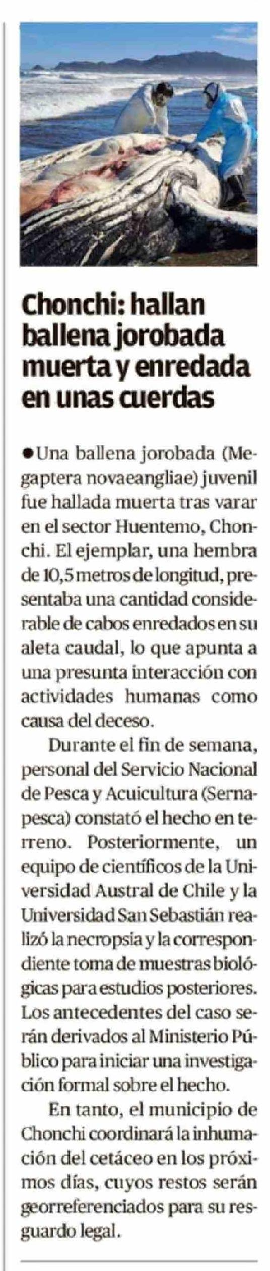 Título: Chonchi: hallan ballena jorobada muerta y enredada en unas cuerdas
