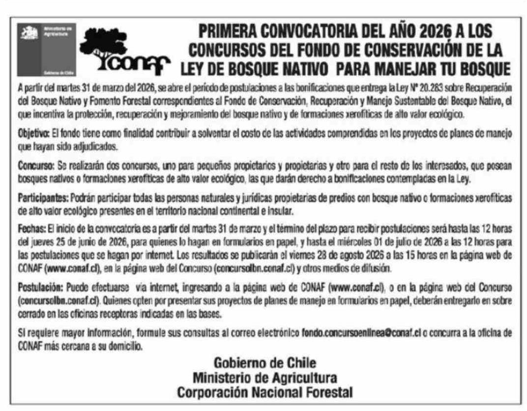 Aviso Licitaciones: PRIMERA CONVOCATORIA DEL AÑO 2026 A LOS CONCURSOS DEL FONDO DE CONSERVACIÓN DE LA LEY DE BOSQUE NATIVO PARA MANEJAR TU BOSQUE 30-03-2026 El Llanquihue |