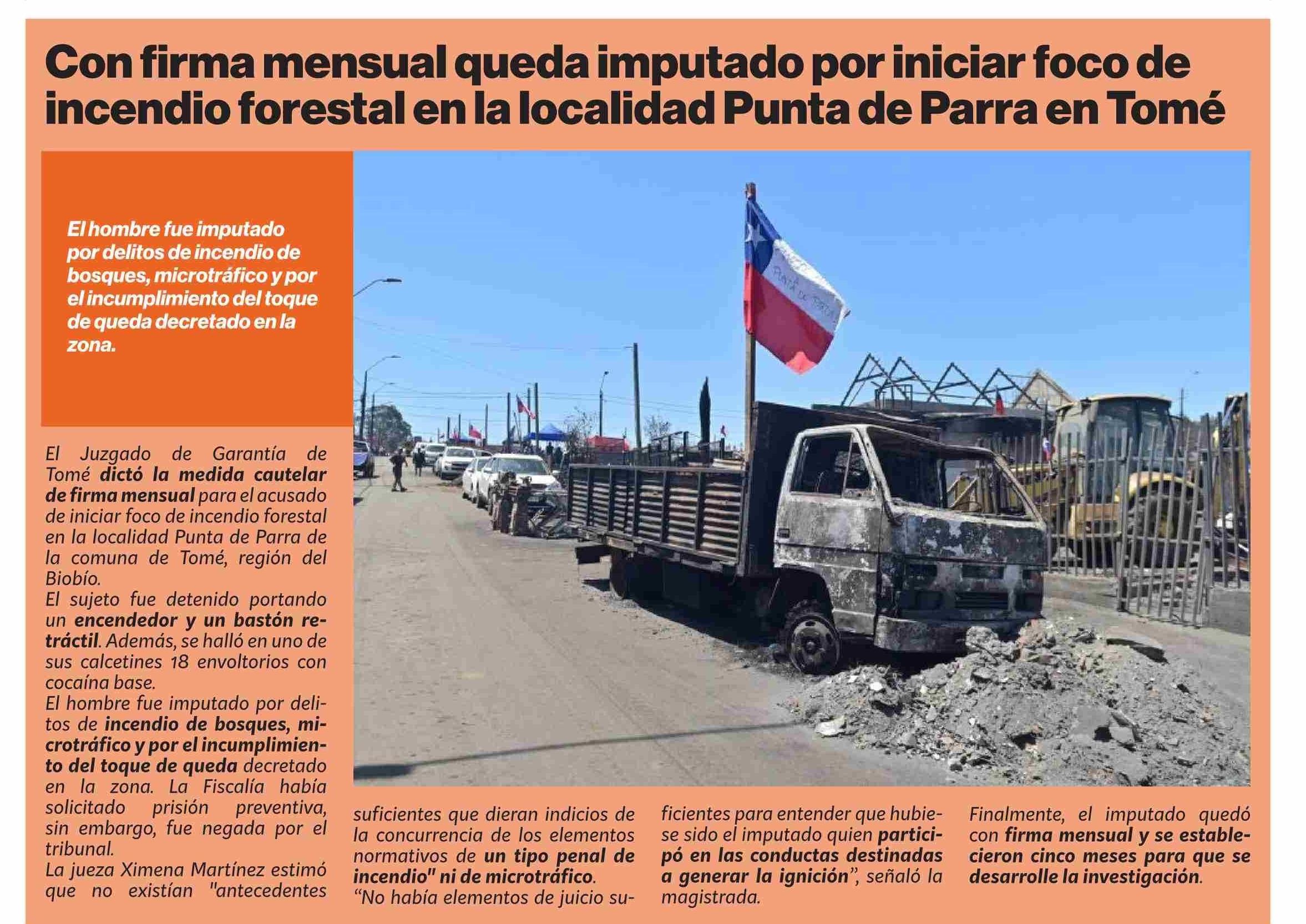 | Título: | Con firma mensual queda imputado por iniciar foco de incendio forestal en la localidad Punta de Parra en Tomé |