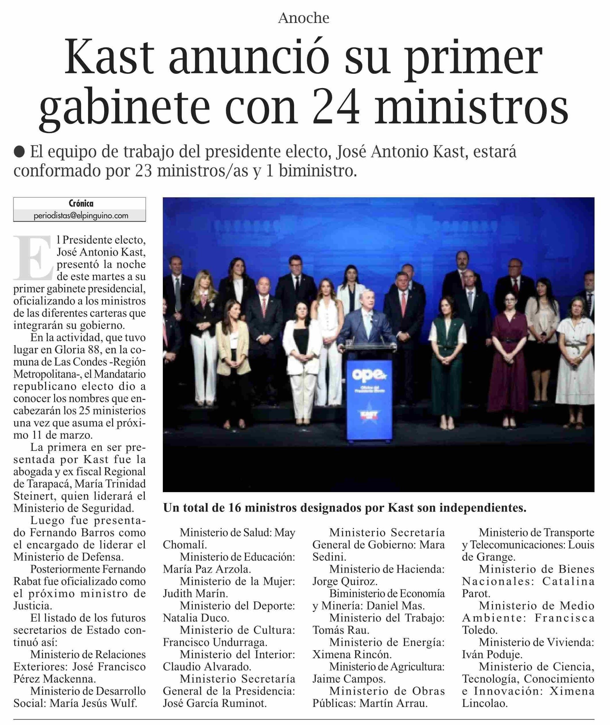 Título: Kast anunció su primer gabinete con 24 ministros