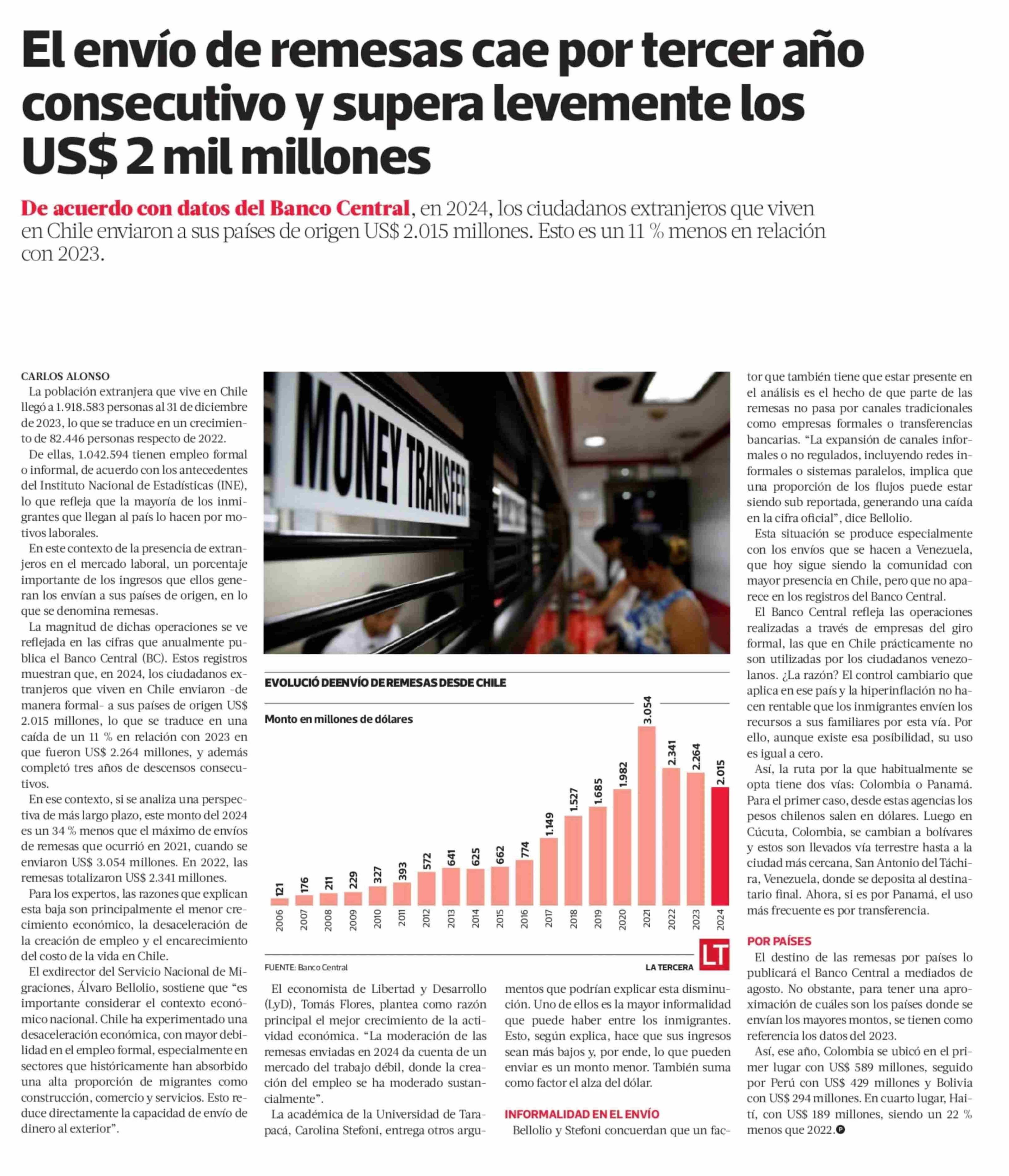 Título: El envío de remesas cae por tercer año consecutivo y supera levemente los US$ 2 mil millones