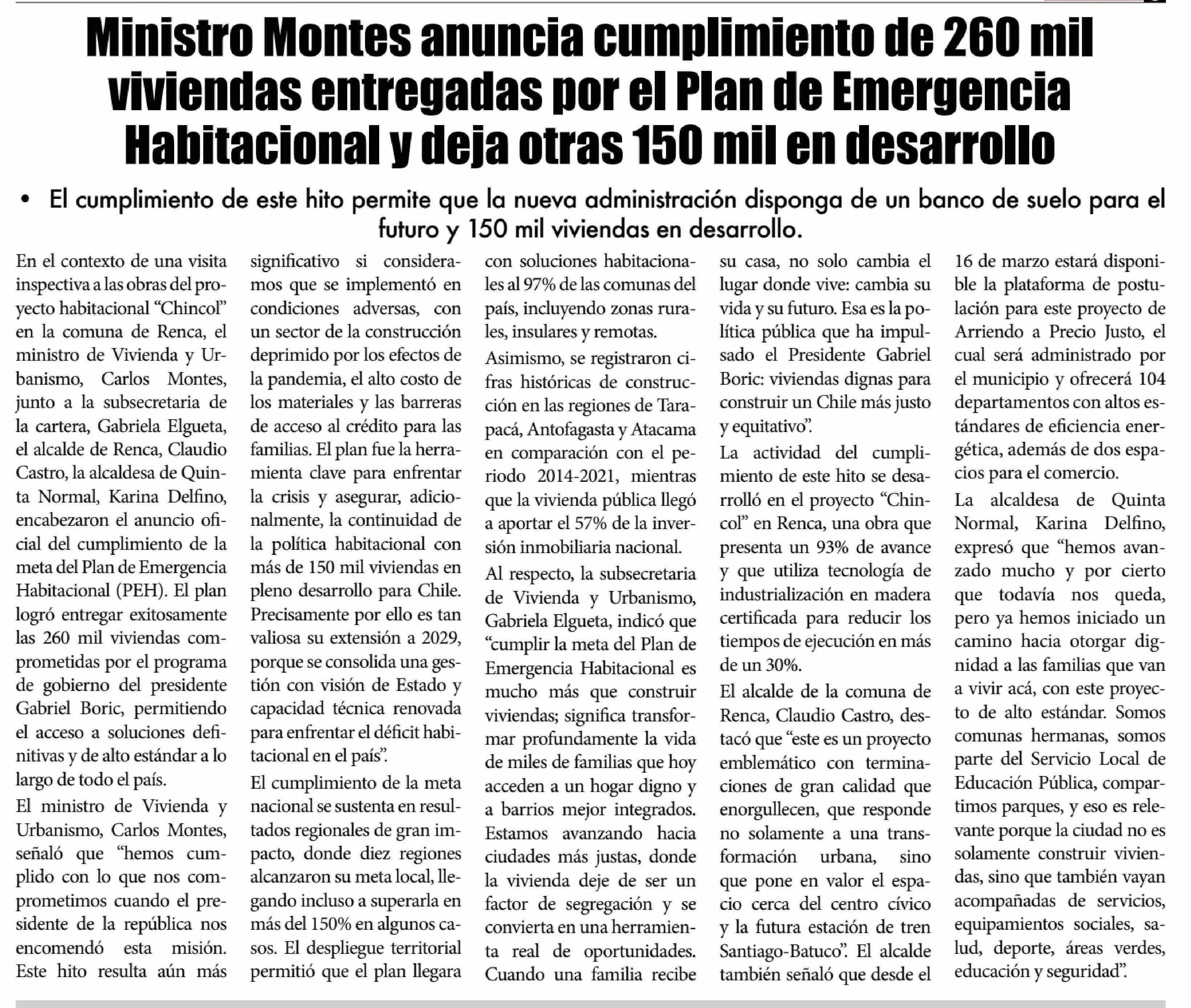 Ministro Montes anuncia cumplimiento de 260 mil viviendas entregadas por el Plan de Emergencia Habitacional y deja otras 150 mil en desarrollo 03-03-2026 El Lector |