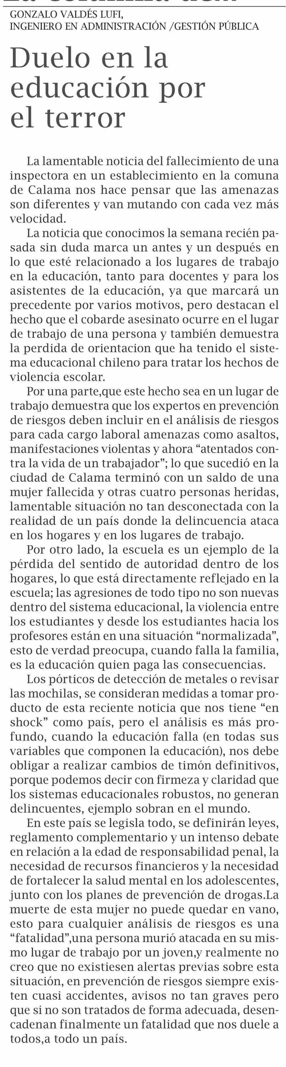 Título: Columnas de Opinión: Duelo en la educación por el terror