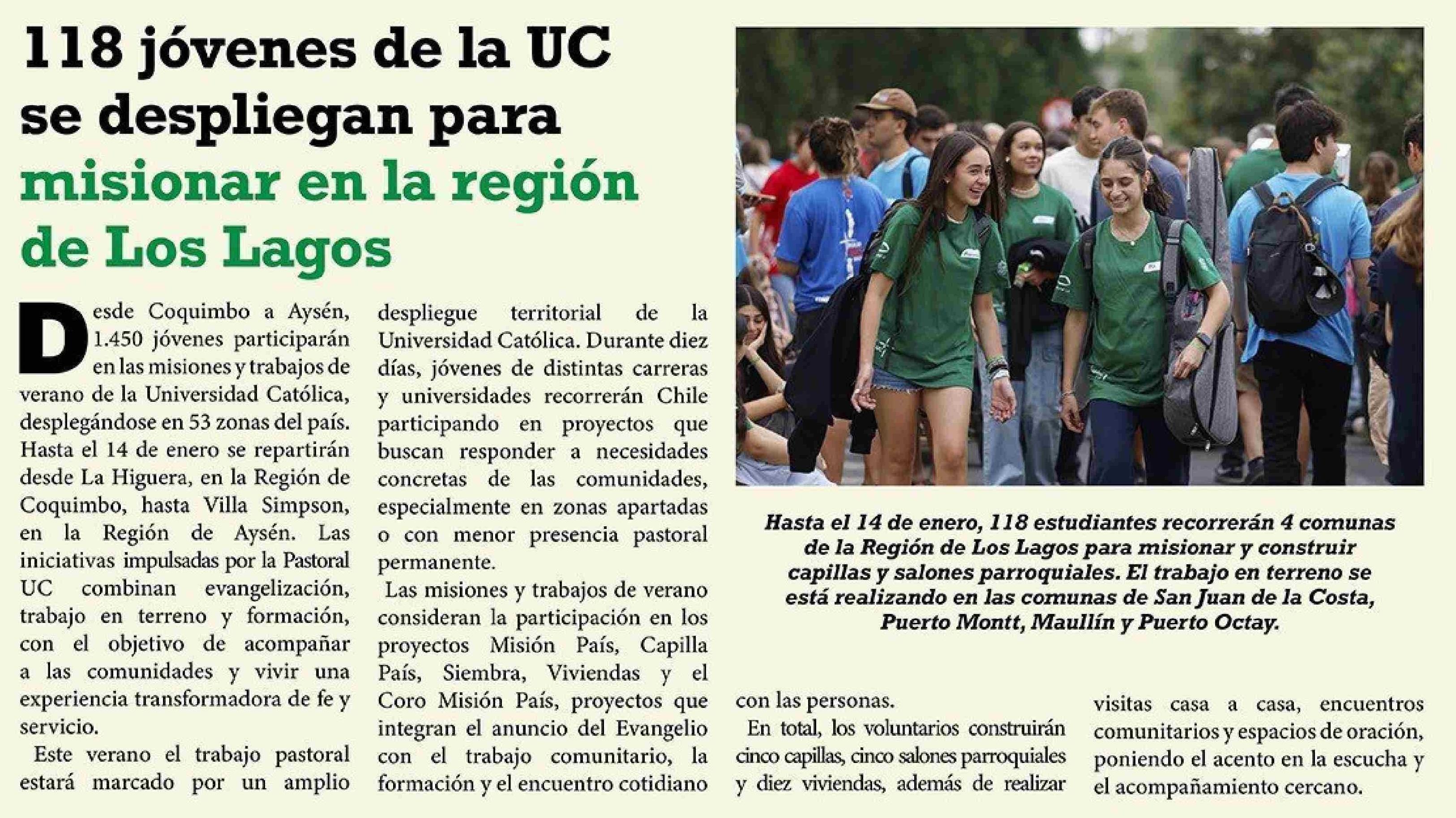 118 Jóvenes de la UC se despliegan para misionar en la región de Los Lagos 13-01-2026 El Heraldo Austral |