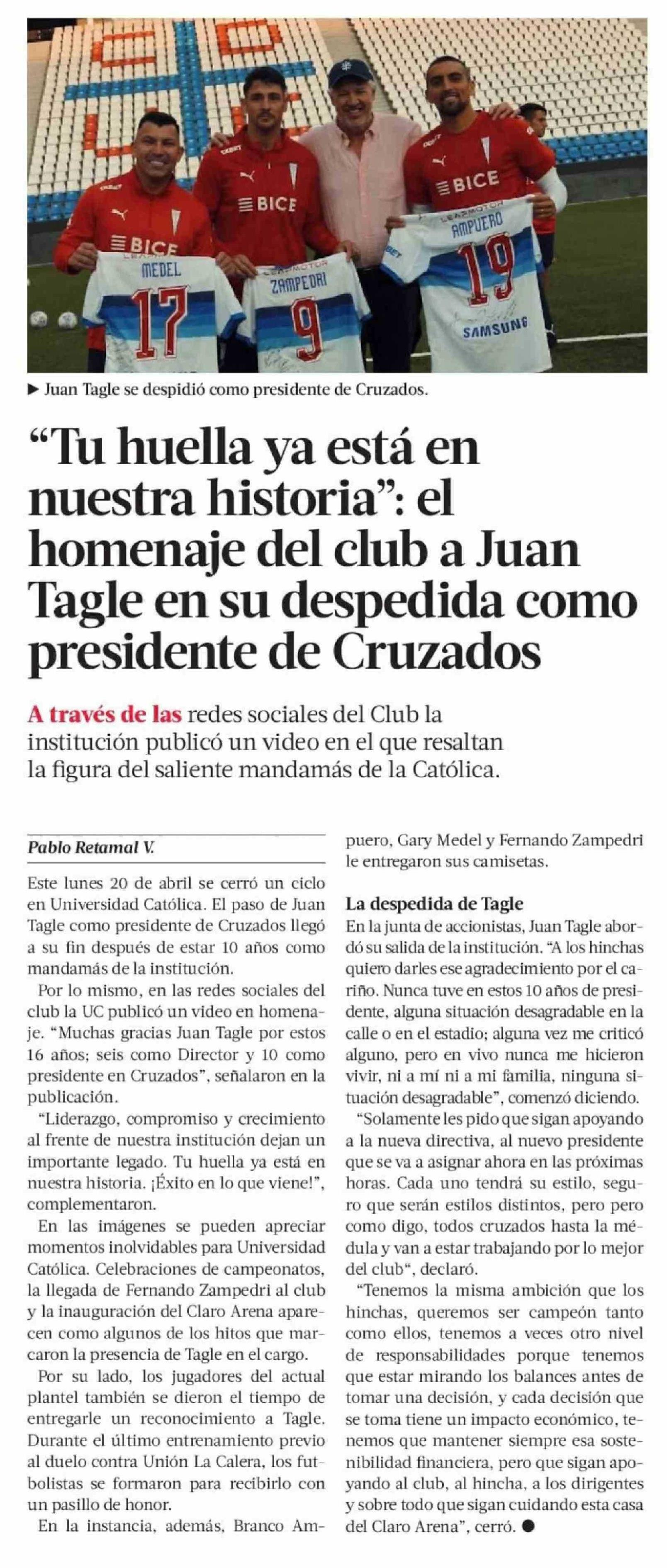 "Tu huella ya está en nuestra historia": el homenaje del club a Juan Tagle en su despedida como presidente de Cruzados 21-04-2026 La Tercera |