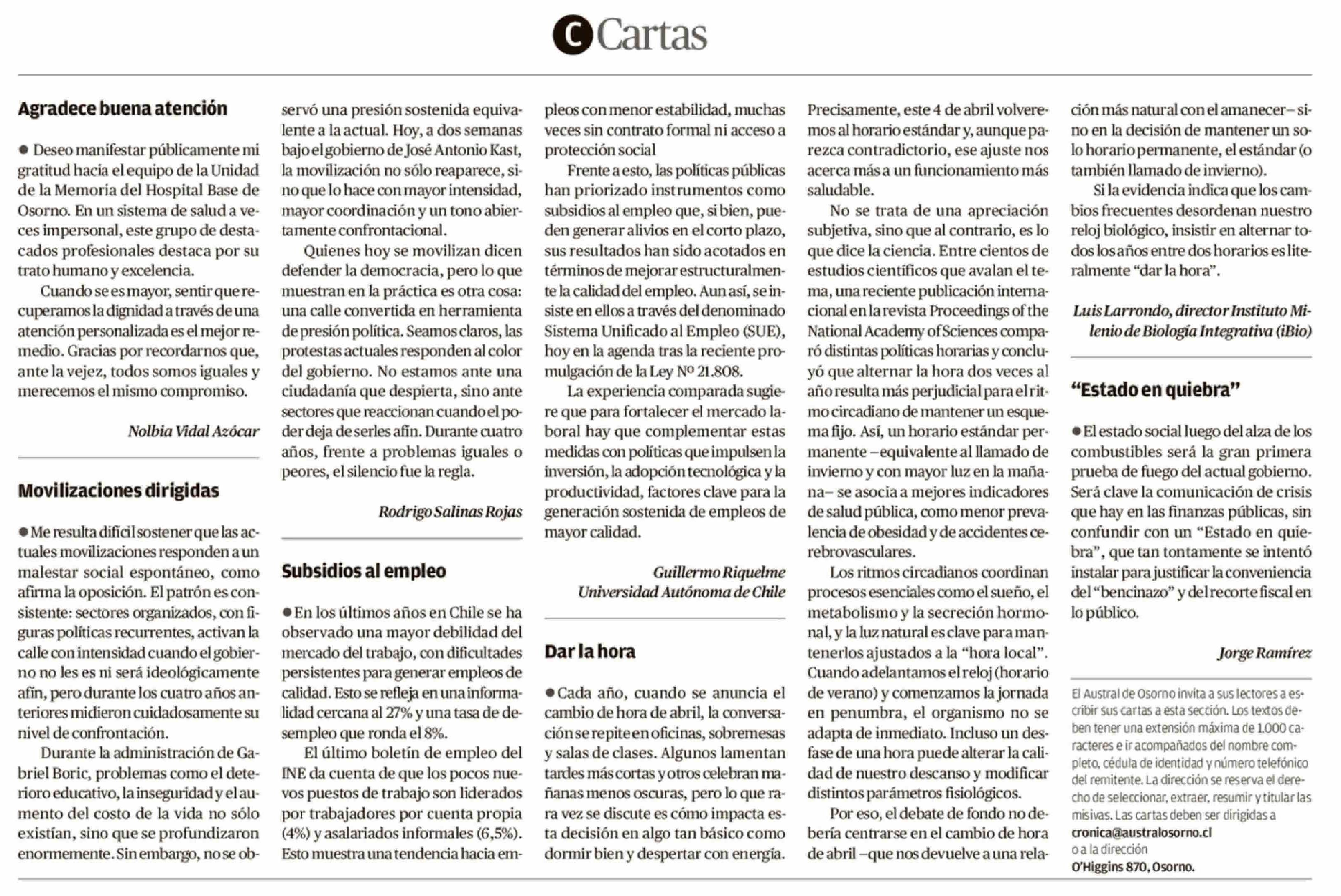 | Título: | Cartas: · Deseo manifestar públicamente mi gratitud hacia el equipo de la Unidad de la Memoria del Hospital Base de Osorno. En un sistema de salud a veces impersonal, este grupo de destacados profesionales destaca por su trato humano y excelencia. Cuando se es mayor, sentir que recuperamos la dignid |