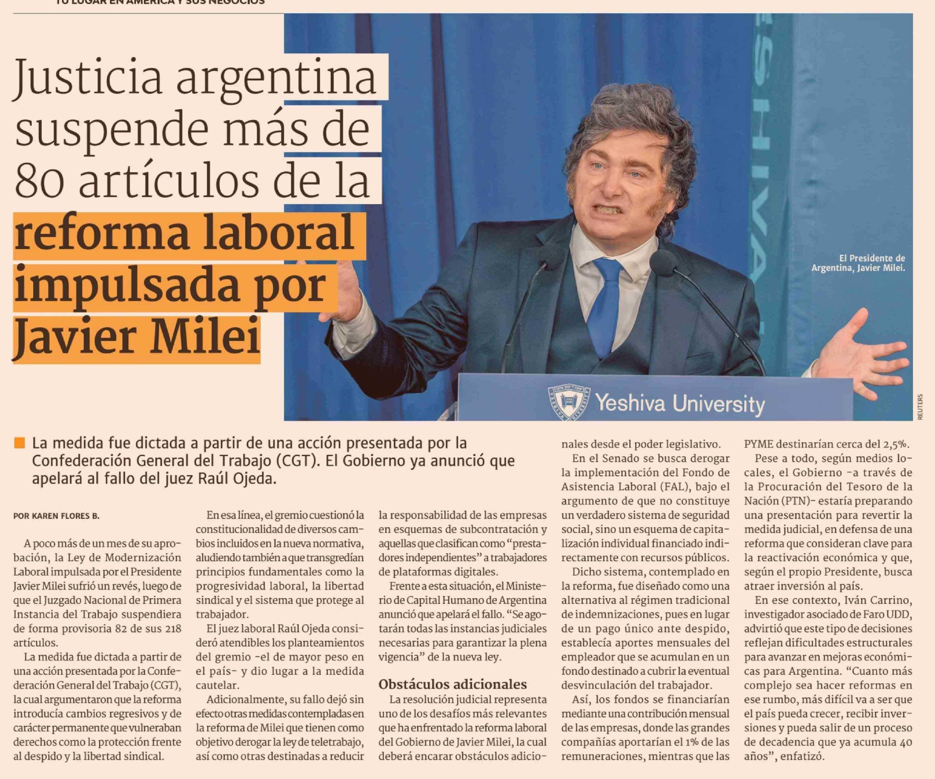Título: Justicia argentina suspende más de 80 artículos de la reforma laboral impulsada por Javier Milei
