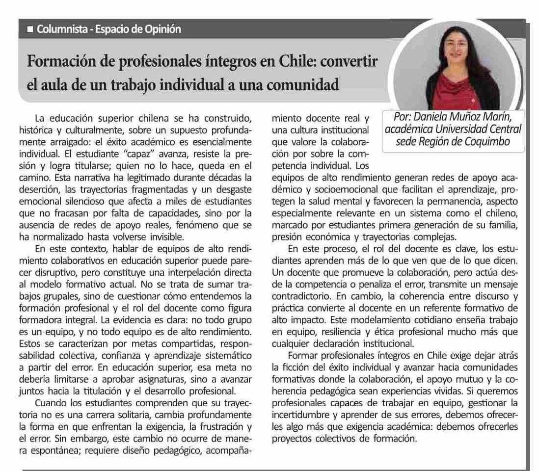 Título: Columnas de Opinión: Formación de profesionales íntegros en Chile: convertir el aula de un trabajo individual a una comunidad