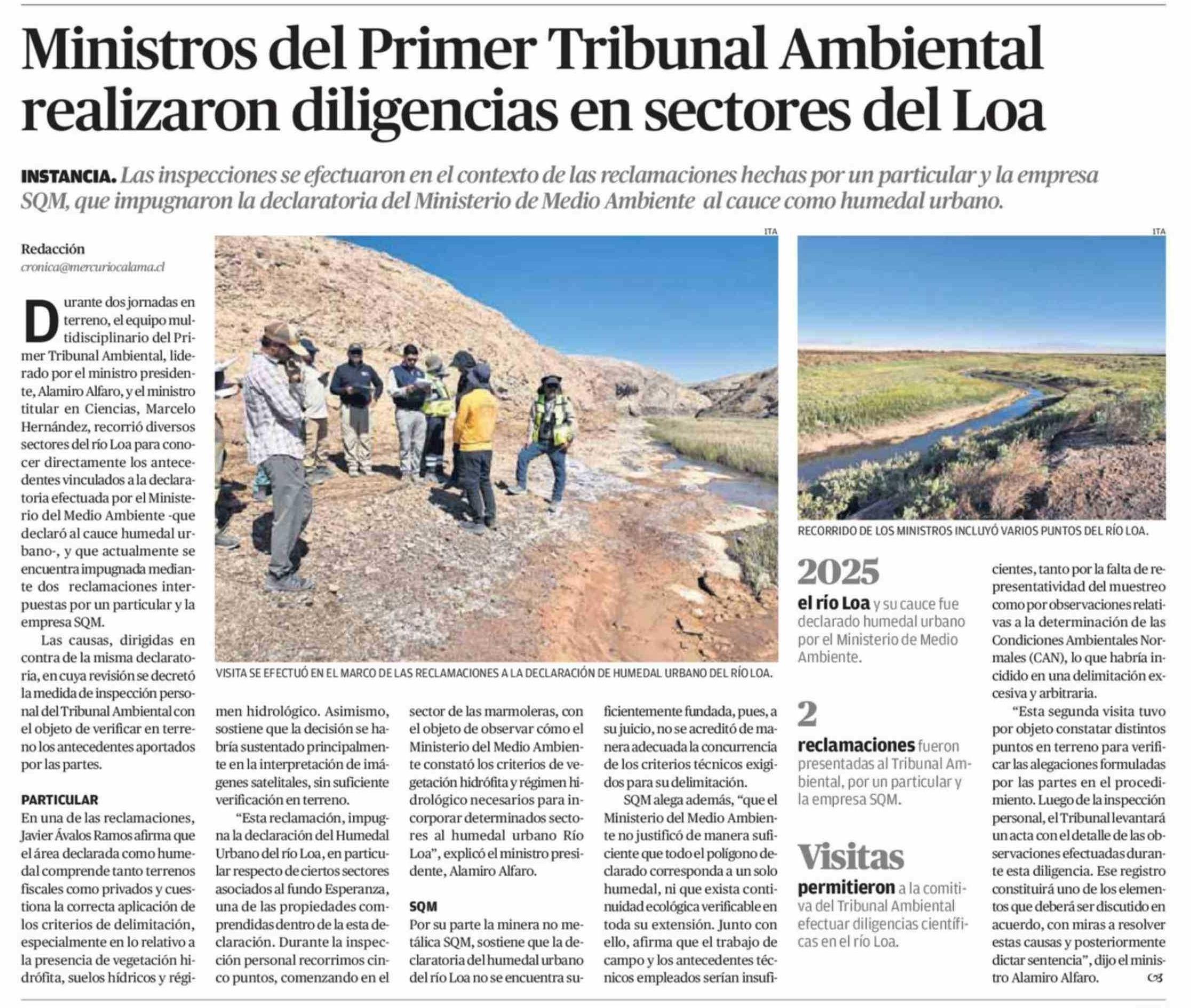 Ministros del Primer Tribunal Ambiental realizaron diligencias en sectores del Loa 11-03-2026 El Mercurio de Calama |