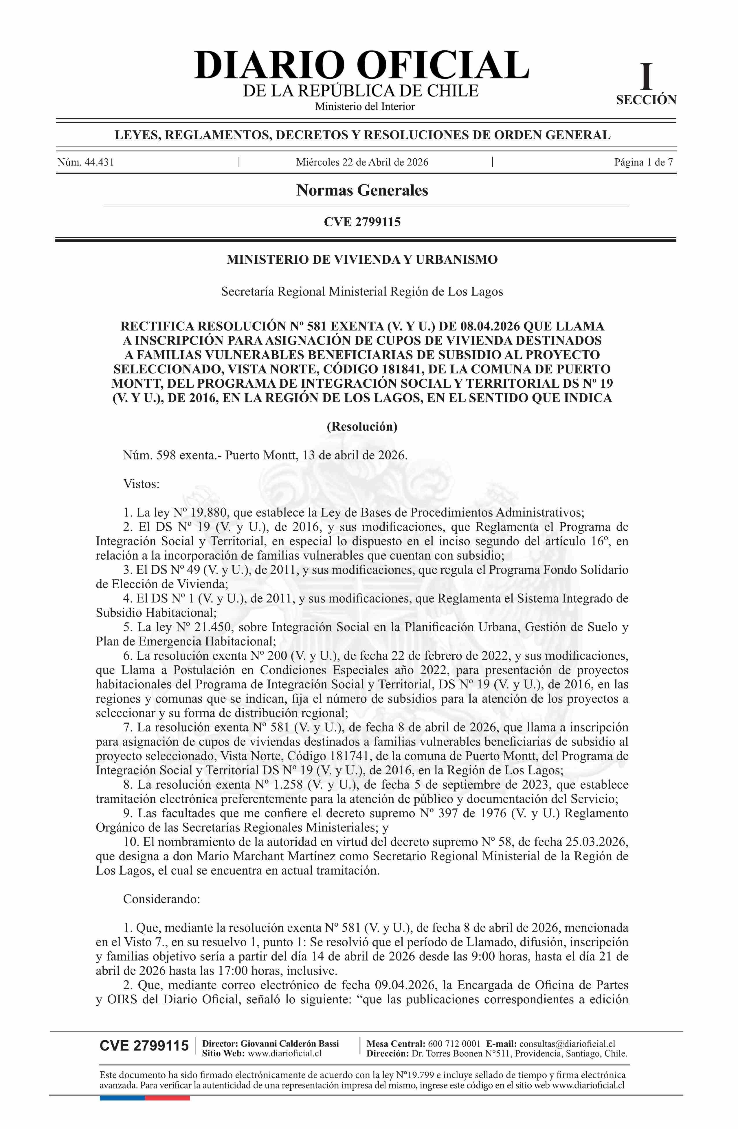 Título: Resolución exenta número 598, de 2026.- Rectifica resolución Nº 581 exenta, de 2026, que llama a inscripción para asignación de cupos de vivienda destinados a familias vulnerables beneficiarias de subsidio al proyecto seleccionado, vista norte, código 181841, de la comuna de Puerto Montt, del Progra