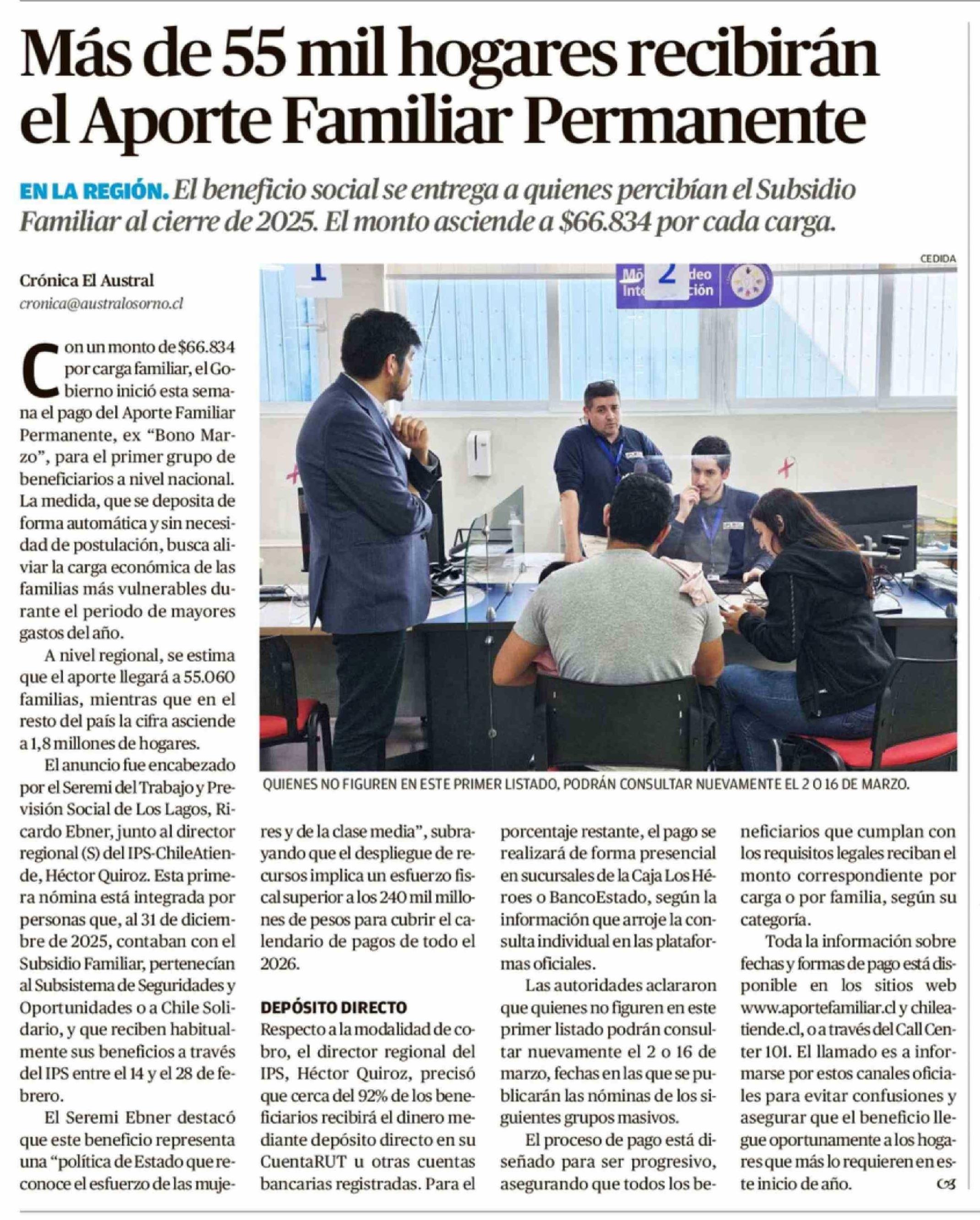 Más de 55 mil hogares recibirán el Aporte Familiar Permanente 21-02-2026 El Austral de Osorno |