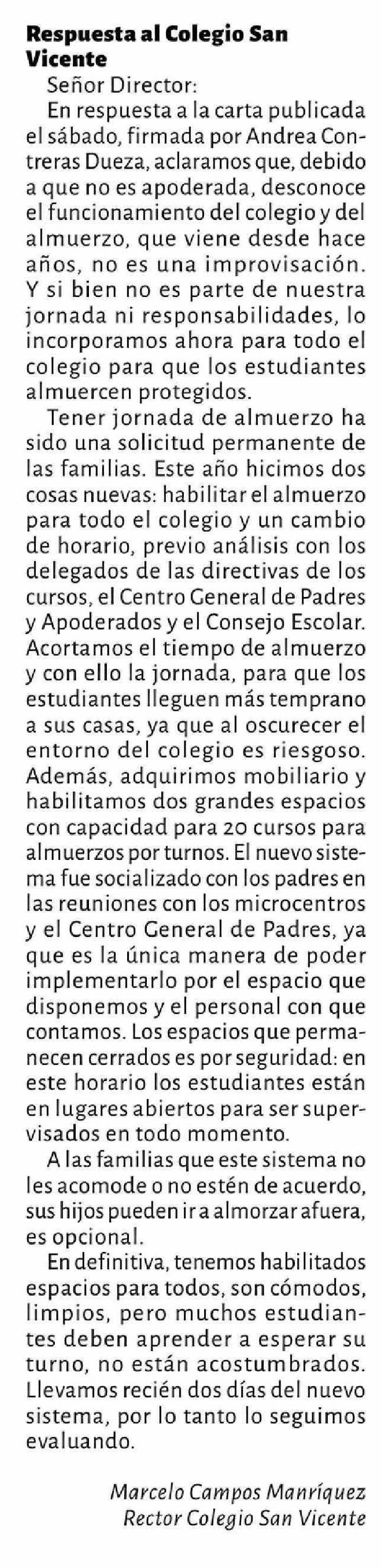 Título: Cartas: Respuesta al Colegio San Vicente Señor Director: En respuesta a la carta publicada el sábado, firmada por Andrea Contreras Dueza, aclaramos que, debido a que no es apoderada, desconoce el funcionamiento del colegio y del almuerzo, que viene desde hace años, no es una improvisación. Y si bien